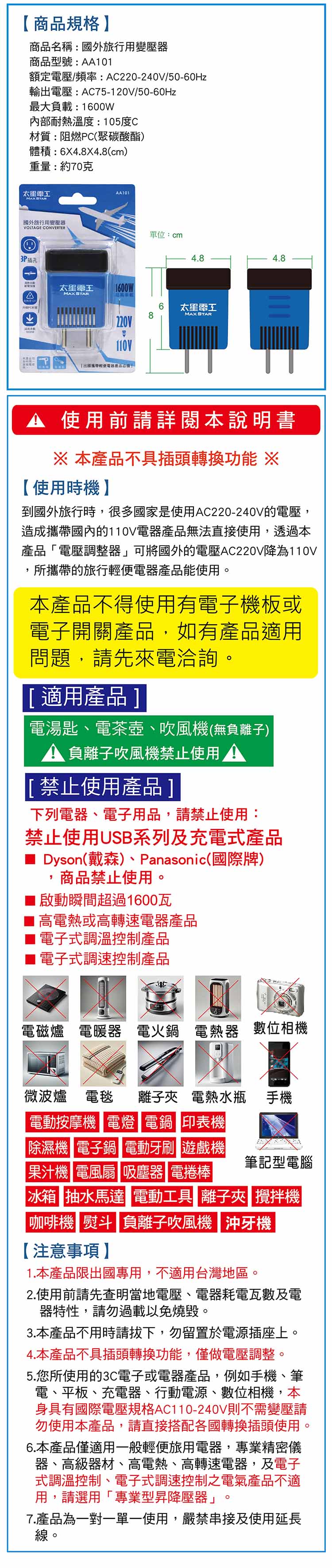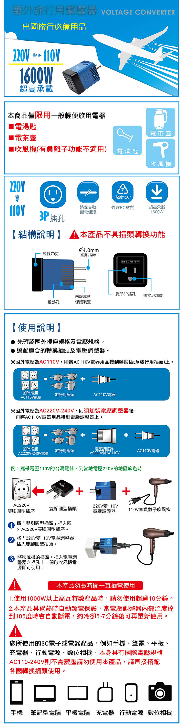 ◆商品特色1600W超高承載。3P插孔。過熱自動斷電保護。外殼PC材質,耐熱度120度C。享受科技 輕巧 方便。◆商品規格與尺寸尺寸:(高)7.9x (寬)4.8x (深)4.8(公分)包裝:(高)15.6x (寬)9.5x (深)5(公分)重量:0.1kg電壓輸入:AC220~240V;50/60Hz電壓輸出:AC110~120V;50/60Hz最大負載:1600W安全負載:1000W內部耐熱溫度:105度C材質:阻燃PC(耐熱120度C)產地:中國入數:2入◆注意**本商品不具備插座轉換功能,僅做電壓調整。**購買前請注意圖文說明或有關商品問題可先來電洽詢。