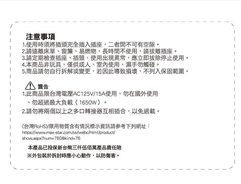 ◆商品特色 1.插座分接:適用於分接不夠使用之插座孔。 2.加大插座間距:方便變壓器使用。 3.獨立開關:有效管理電源開啟及關閉,減少電器待機電流損耗,節能省電。 4.防火耐燃:外殼採PC材質,防火耐燃。 5.接地端子:預防電器產品漏電。 6.台灣製造,品質有保障。 7.本產品已投保新台幣三仟伍佰萬產品責任險。 ◆商品規格與尺寸 商品尺寸:(高)9.5x(寬)6x(深)4.6/公分 商品包裝:(高)17.5x(寬)10x(深)5/公分 商品重量:0.086kg 包裝重量:0.1kg 商品型號:B222 額定輸入電壓:AC125V 額定頻率:60Hz 額定電流 : 15A 最高負載:1650W MAX 材質 : PC(聚碳酸酯)、銅 驗證登錄 : R53951 RoHS 原產地:中華民國 台灣 入數:黑色,3入 ◆注意事項 1.使用時須將插頭完全插入插座,二者間不可有空隙。 2.請遠離床單、窗簾、易燃物,長時間不使用,請拔離插座。 3.請定期檢查插座、插頭,使用出現異常,應立即拔除停止使用。 4.本商品非玩具,僅供成人、室內使用,濕手勿觸碰。 5.商品請勿自行拆解或變更,若因此導致損壞,不列入保固範圍。 ◆警告 1.此商品限台灣電壓AC125V/15A使用,勿在國外使用、勿超過最大負載(1650W)。 2.請勿將兩個以上之多口轉接器互相插合,以免過載。