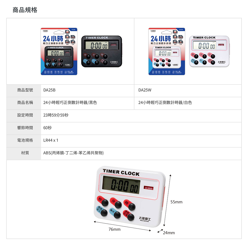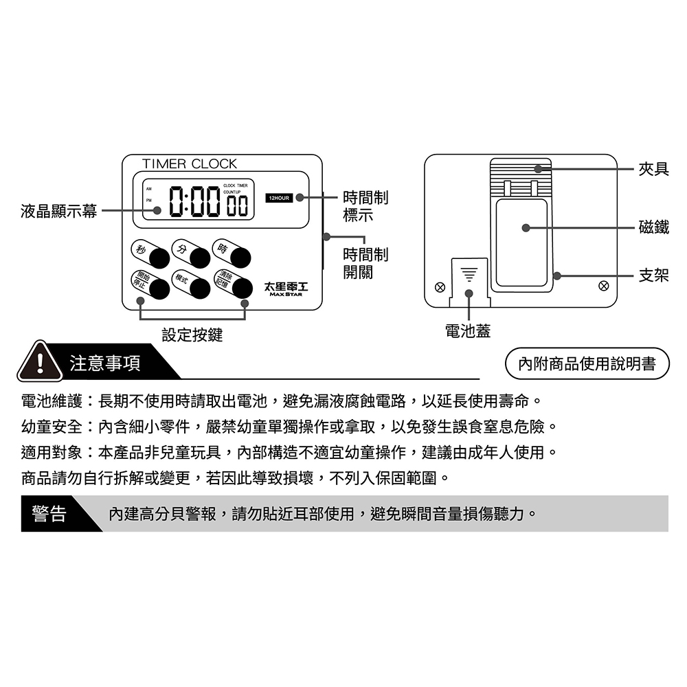 7.本產品已投保新台幣三仟伍佰萬產品責任險。◆商品規格與尺寸商品尺寸:(高)7.6x(寬)5.5x(深)2.4公分商品包裝:(高)14.2x(寬)11.1x(深)2.5/公分商品重量:0.03kg包裝重量:0.05kg時間設定:23時59分59秒響鈴時間:60秒電池規格:LR44 x 1材質:ABS(丙烯腈-丁二烯-苯乙烯共聚物)驗證登錄:免檢商品原產地:中國數量:6入裝◆注意事項電池維護:長期不使用時請取出電池,避免漏液腐蝕電路,以延長使用壽命。幼童安全:內含細小零件,嚴禁幼童單獨操作或拿取,以免發生誤食窒息危險。適用對象:本產品非兒童玩具,內部構造不適宜幼童操作,建議由成年人使用。商品請勿自行拆解或變更,若因此導致損壞,不列入保固範圍。◆警告內建高分貝警報,請勿貼近耳部使用,避免瞬間音量損傷聽力。