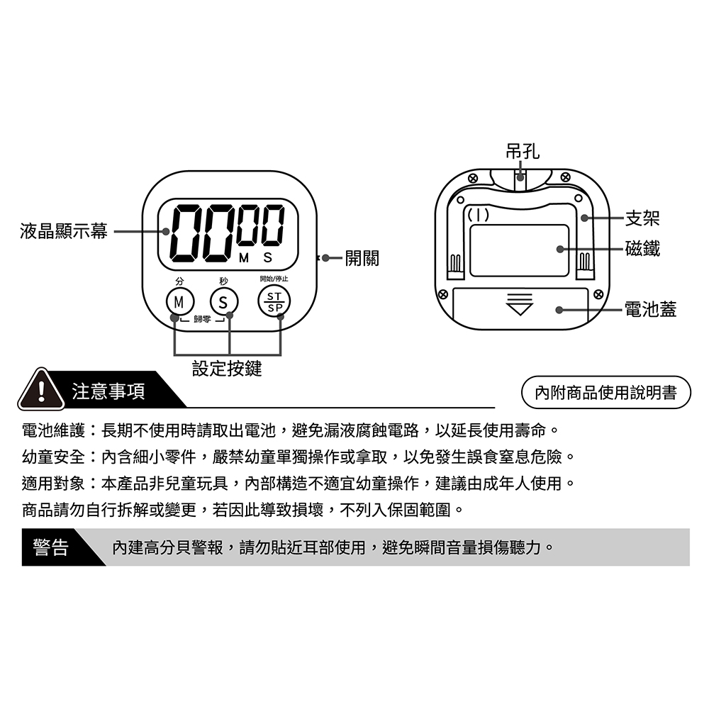8.本產品已投保新台幣三仟伍佰萬產品責任險。◆商品規格與尺寸商品尺寸:(高)6.6x(寬)7.3x(深)2.3公分商品包裝:(高)14.2x(寬)11.1x(深)2.8/公分商品重量:0.04kg包裝重量:0.06kg時間設定:99分59秒響鈴時間:60秒電池規格:AAA 4號電池 x 1(須另購)材質:ABS(丙烯腈-丁二烯-苯乙烯共聚物)驗證登錄:免檢商品原產地:中國數量:6入裝◆注意事項電池維護:長期不使用時請取出電池,避免漏液腐蝕電路,以延長使用壽命。幼童安全:內含細小零件,嚴禁幼童單獨操作或拿取,以免發生誤食窒息危險。適用對象:本產品非兒童玩具,內部構造不適宜幼童操作,建議由成年人使用。商品請勿自行拆解或變更,若因此導致損壞,不列入保固範圍。◆警告內建高分貝警報,請勿貼近耳部使用,避免瞬間音量損傷聽力。