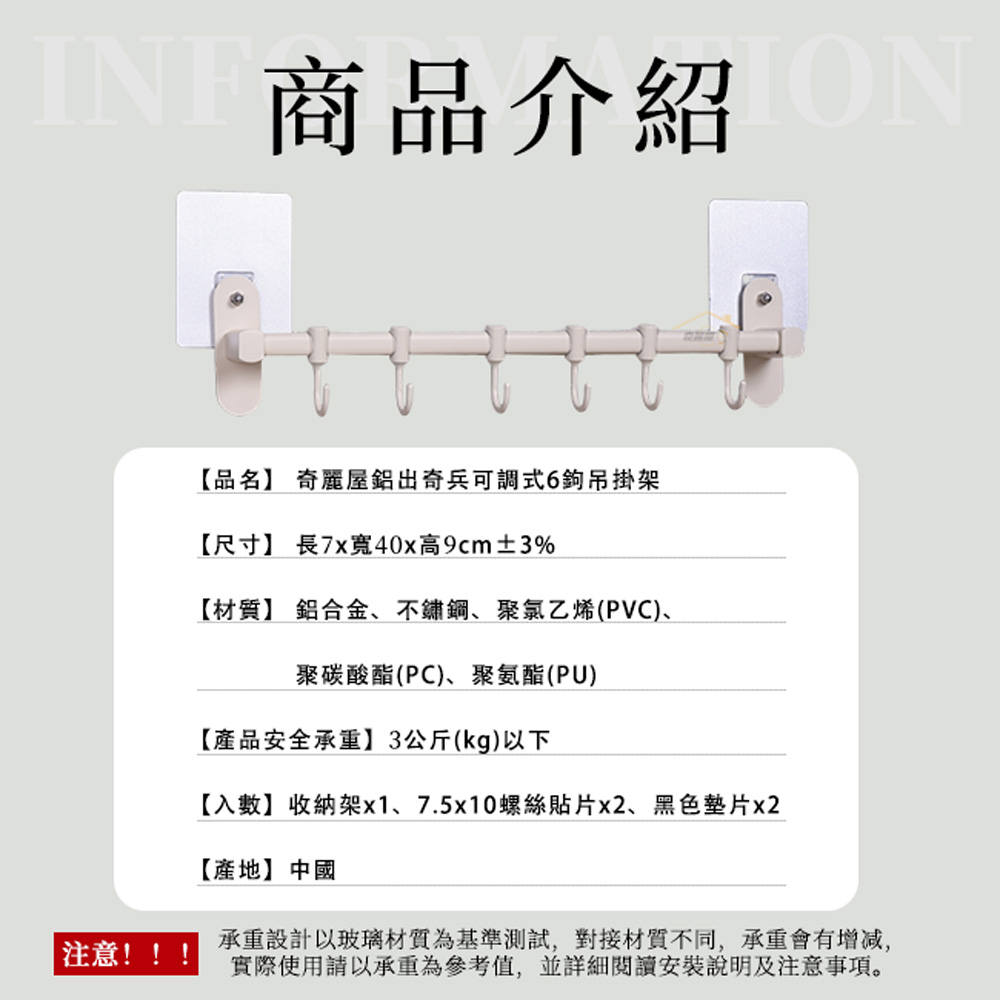 品名:奇麗屋鋁出奇兵可調式6勾吊掛架貨號:1483材質:鋁合金、不鏽鋼、聚氯乙烯(PVC)、聚碳酸酯(PC)、聚氨酯(PU)規格:長7x寬40x高9公分(cm)±3%重量:0.347公斤(kg)±5%(放置架)入數:放置架x1個、7.5x10螺絲貼片x2片、黑色墊片x2片產品安全承重:3公斤(kg)以下製造日期:標示於商品外盒上保存期限:未拆封10年產地:中國