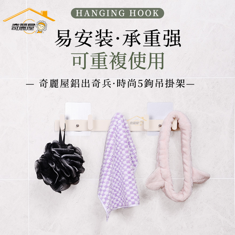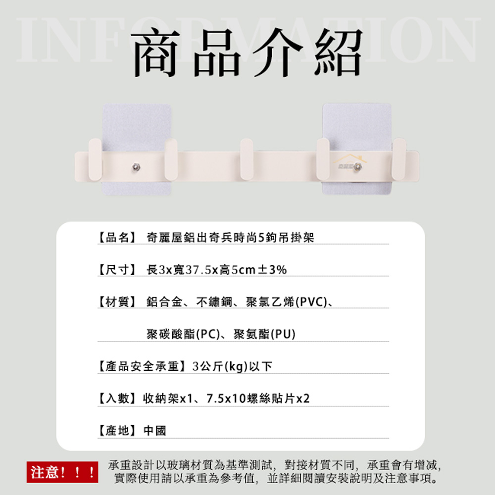 品名:奇麗屋鋁出奇兵時尚5勾吊掛架貨號:1490材質:鋁合金、不鏽鋼、聚氯乙烯(PVC)、聚碳酸酯(PC)、聚氨酯(PU)規格:長3x寬37.5x高5公分(cm)±3%重量:0.2公斤(kg)±5%(放置架)入數:放置架x1個、7.5x10螺絲貼片x2片產品安全承重:3公斤(kg)以下製造日期:標示於商品外盒上保存期限:未拆封10年產地:中國