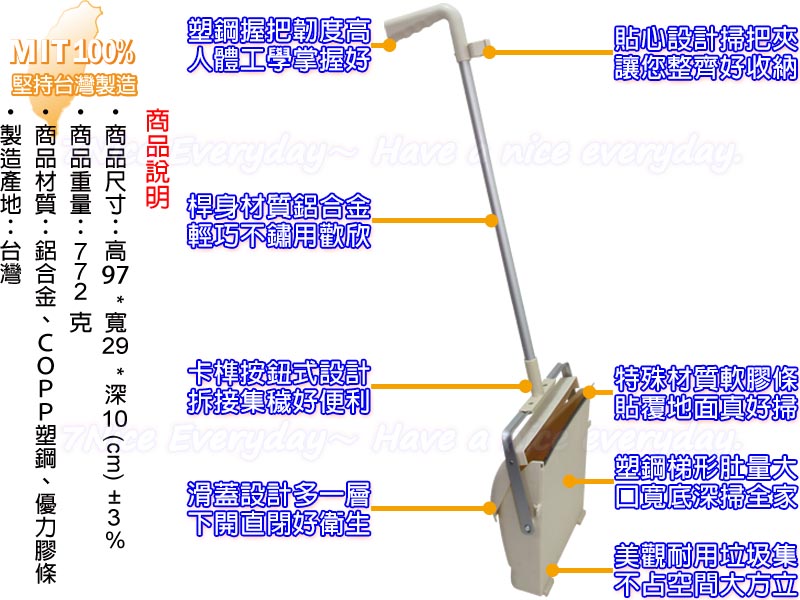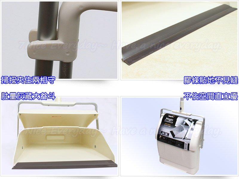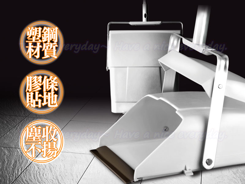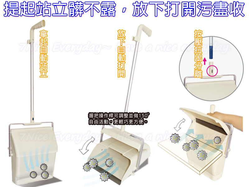 1.站立放置時,畚斗口緊閉,灰塵髒東西完全盡藏不外漏。 2.搭配奇麗掃,隨意掃隨意擺,漂亮美觀。3.放下它自動打開,拿起來自動收藏。超衛生不塵揚。4.特殊耐壓COPP塑鋼,經久耐用。