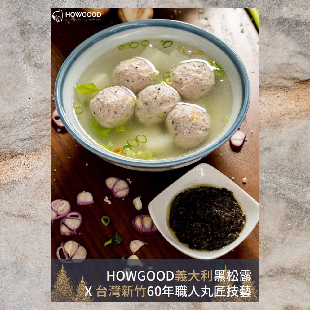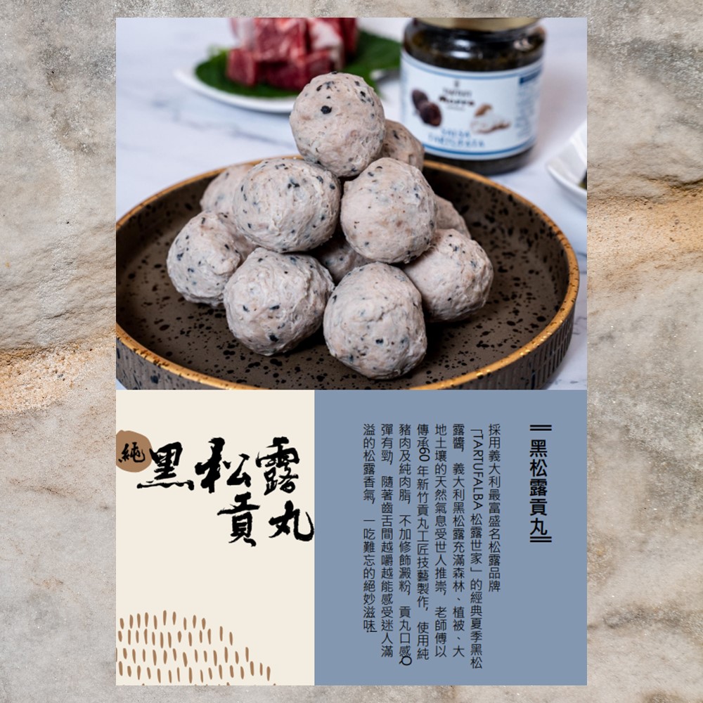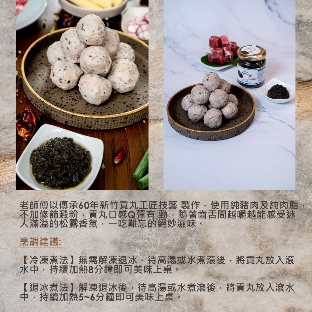採用義大利最富盛名松露品牌:「TARTUFALBA松露世家」經典夏季黑松露醬,義大利黑松露充滿著森林、植被與大地土壤的濃郁香氣,備受世人推崇。老師傅以傳承60年新竹貢丸工匠技藝製作,使用台灣純豬肉以及豬油脂加上義大利原裝進口黑松露,100%純肉貢丸不添加修飾澱粉,不加修飾澱粉,貢丸口感Q彈有勁,越嚼越能感受唇舌間迷人滿溢的松露香氣,Q彈口感口齒留香,讓人一吃難忘的絕妙滋味!