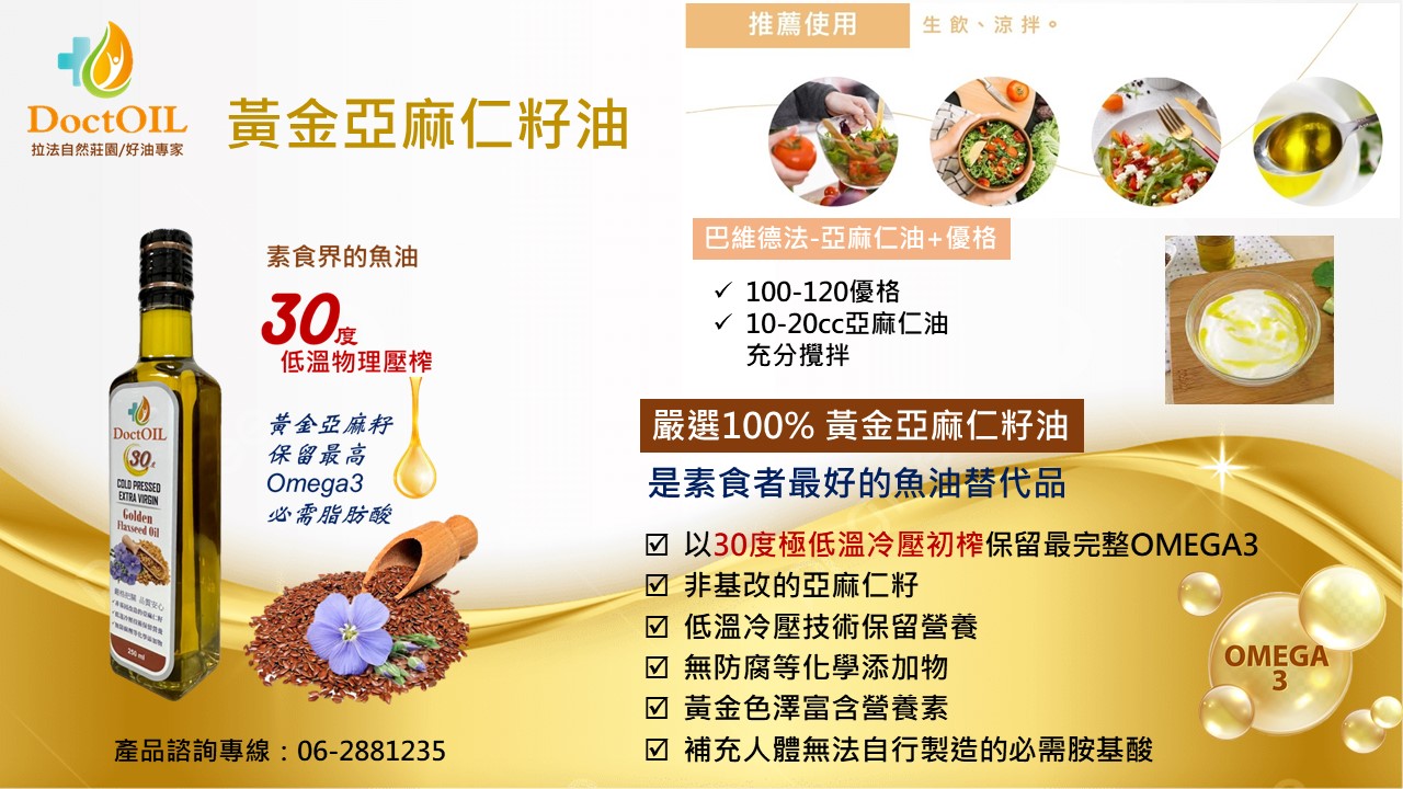 品 名:黃金亞麻仁油 Golden Flaxseed Oil成 分:亞麻仁籽內 容 物:250ml保存期限:一年原 產 地:加拿大保存方式:開封後請放置冷藏存放,盡早食用完畢。 (Omega-3非常容易氧化,所以只要打開,務必存放在冰箱)。食用方法:每日可食用15~30ml 添加至食物中享用。 如: 加入食物或拌菜 **純素可食用**※退換貨須知:7天鑑賞(猶豫)期之權利【鑑賞(猶豫)期非試用期】,辦理退貨商品必須是全新狀態且包裝完整,否則將會影響退貨權限。