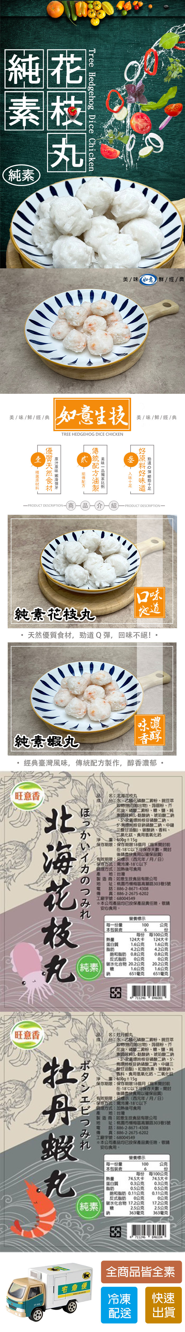 品名:北海花枝丸 成份:水、乙醯化磷酸二澱粉、豌豆萃取物(豌豆抽出物)、蒟蒻粉、芥花油、磷酸二澱粉、糖、鹽、純素調味料(L-麩酸鈉、琥珀酸二鈉、5'-次黃嘌呤核苷鈉磷酸二鈉、5'-鳥嘌呤核苷鈉磷酸二鈉、中鏈三酸甘油酯)、碳酸鈉、香料、二氧化鈦、食用氫氧化鈣
