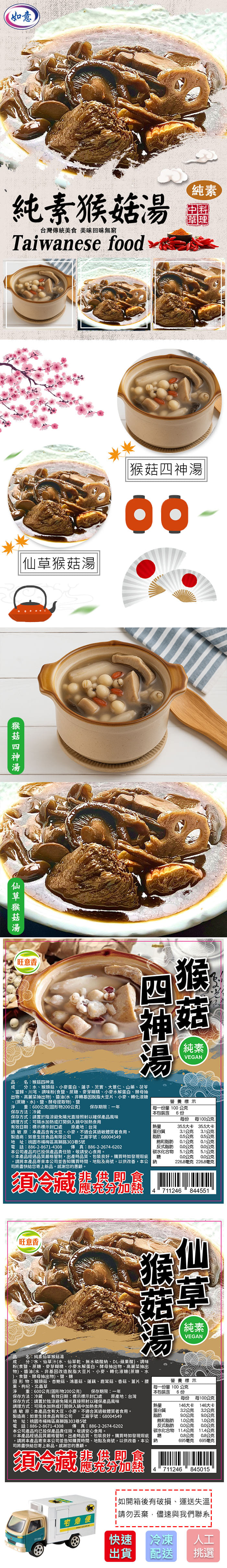 品名:猴菇四神湯(純素) 成份:水、猴頭菇、小麥蛋白、蓮子、芡實、大薏仁、山藥、茯苓、當歸、川芎、調味粉(食鹽、蔗糖、麥芽糊精、小麥水解蛋白、酵母抽出物、高麗菜抽出物)、醬油(水、非轉基因脫脂大豆片、小麥、轉化液糖、(蔗糖、水)、鹽、酵母提取物)、鹽 品名:仙草猴菇湯(純素) 成份:水、仙草汁(水、仙草乾、無水磷酸鈉、DL-蘋果酸)、調味粉(食鹽、蔗糖、麥芽糊精、小麥水解蛋白、酵母抽出物、高麗菜抽出物)、醬油(水、非基因改造脫脂大豆片、小麥、轉化液糖、(蔗糖、水)、食鹽、酵母提取物)、鹽、糖 固形物:猴頭菇、杏鮑菇、鴻喜菇、蓮藕、鹿茸菇、香菇、薑片、腰果、枸杞、北蟲草