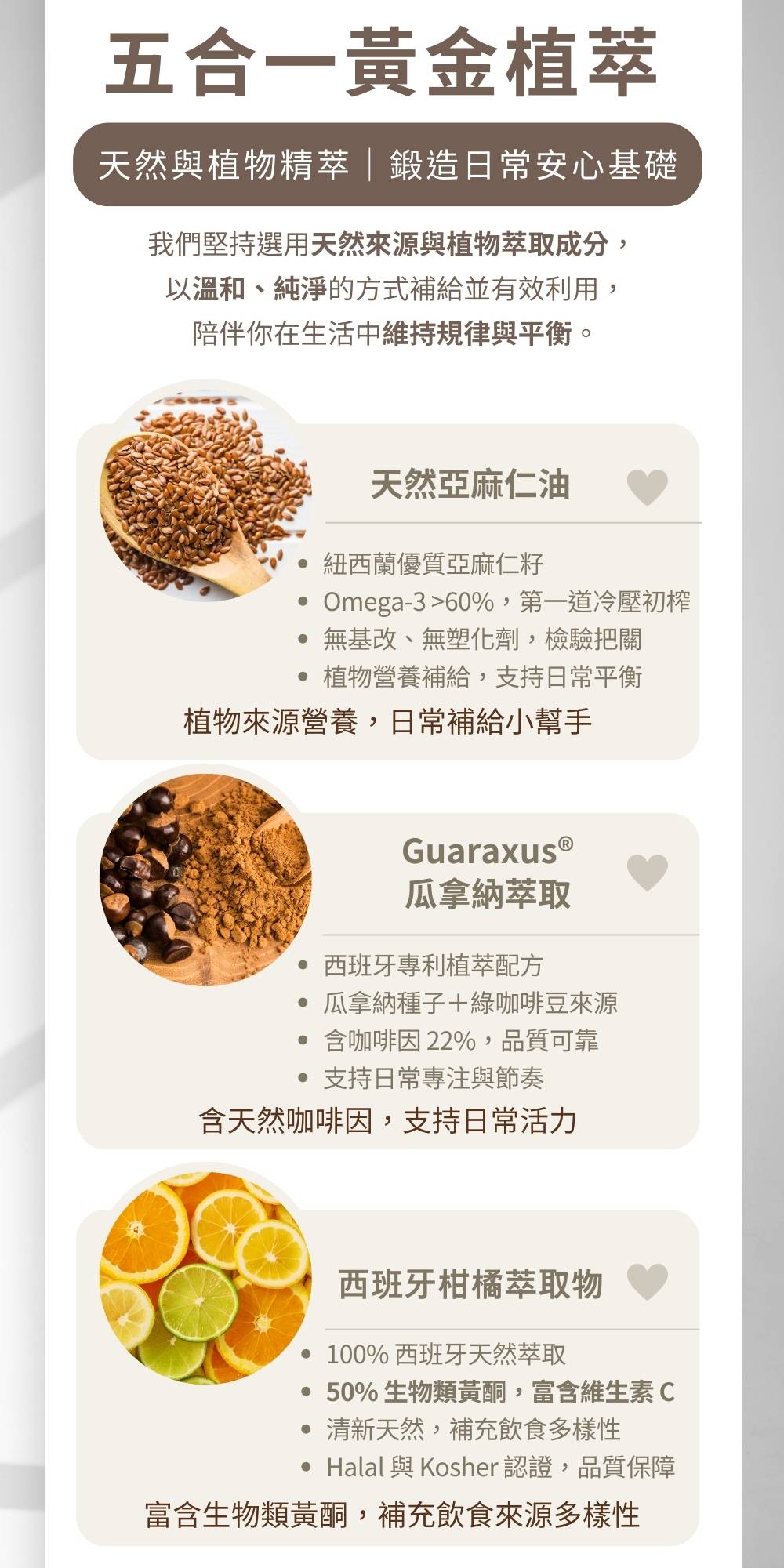 亞麻仁油、瓜拿納萃取(瓜拿納萃取物、麥芽糊精、綠咖啡豆萃取)、柑橘萃取物(含柑橘生物類黃酮)、Ginfort® 專利薑萃取物、BioPerine® 胡椒鹼(專利黑胡椒萃取物)。