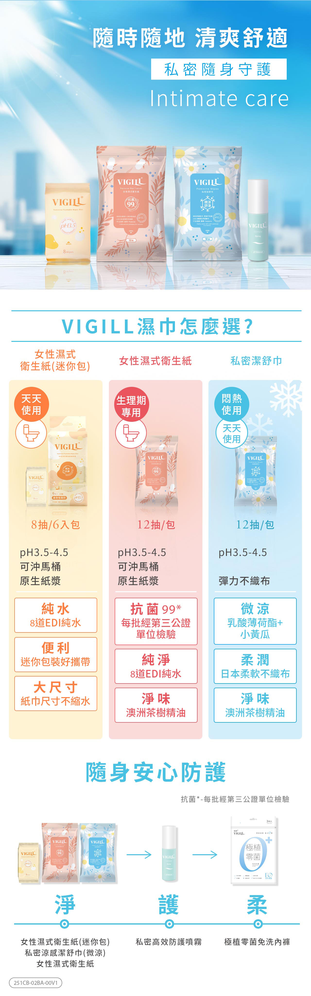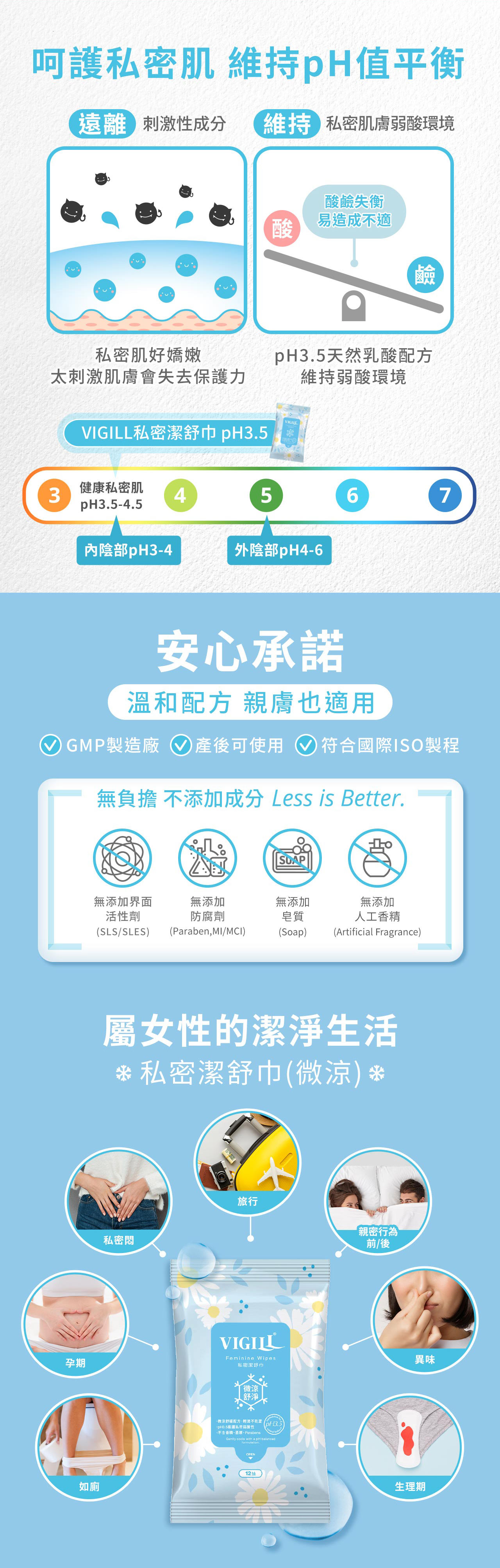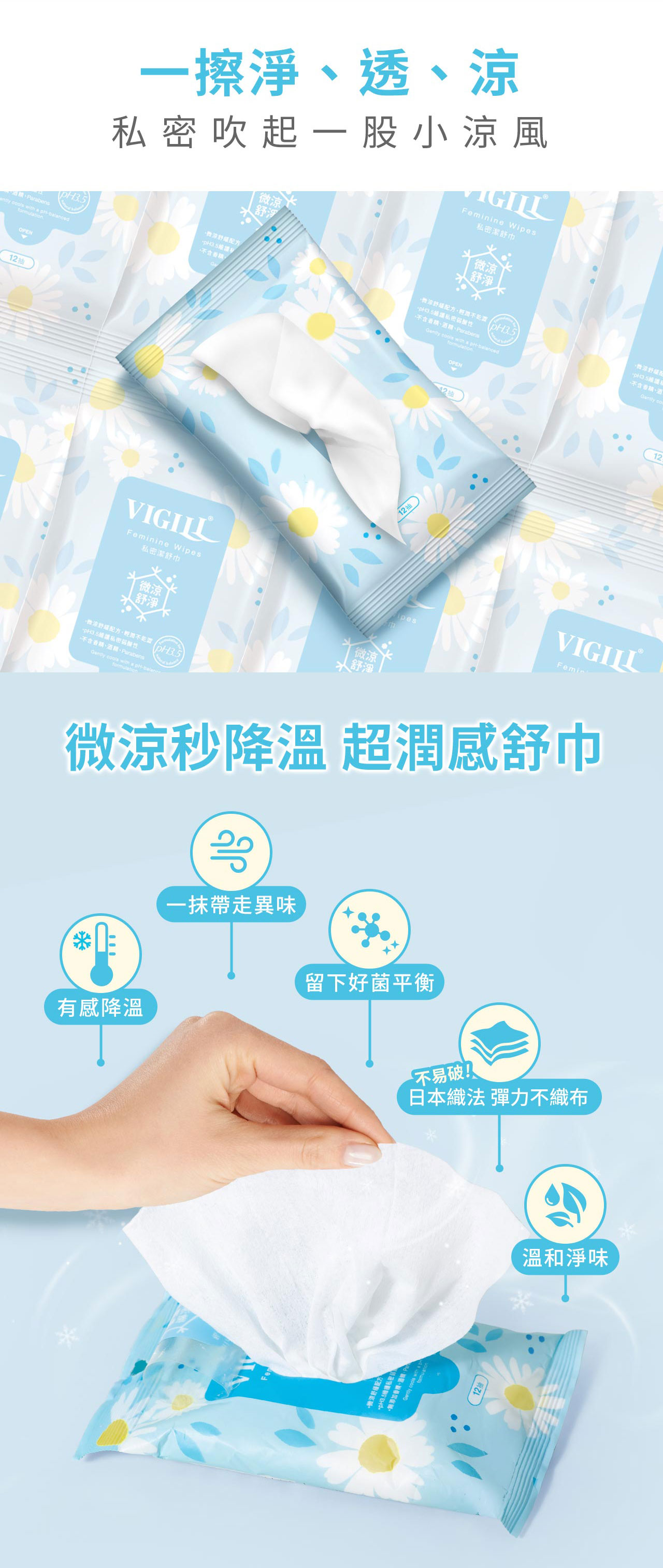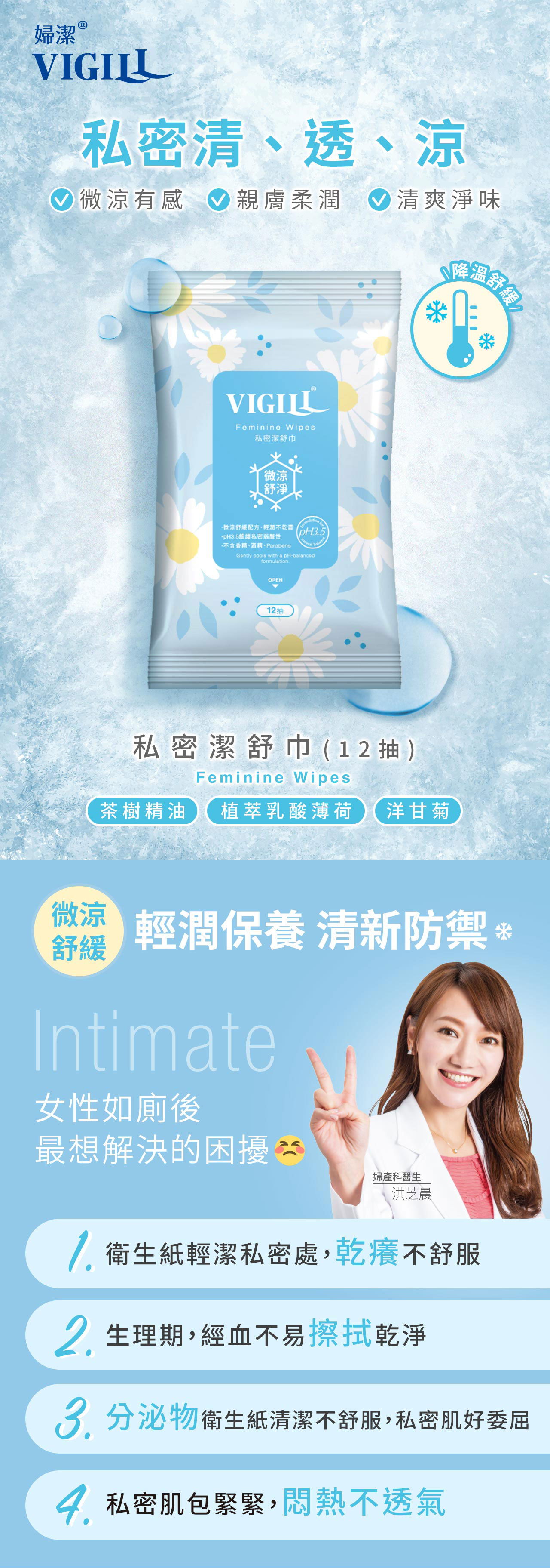 ● 微涼 含小黃瓜、乳酸薄荷酯等清涼成分,用後微涼舒適。● 弱酸 pH 3.5~4.5,含植物萃取的天然乳酸菌萃取(Ferment Filtrate),維護女性私密酸性防護力。● 柔軟 採日本織法的柔軟不織布,如厠後輕擦私密處,乾淨柔嫩。● 淨味 含澳洲有機茶樹精油,去除血污異味,適合平日、外出清潔、生理期使用。