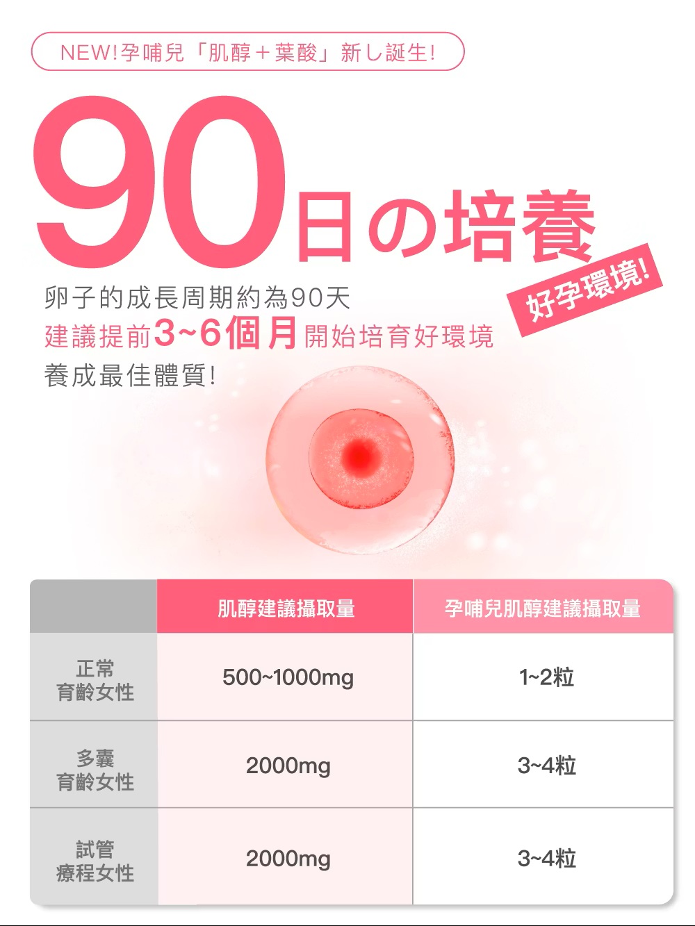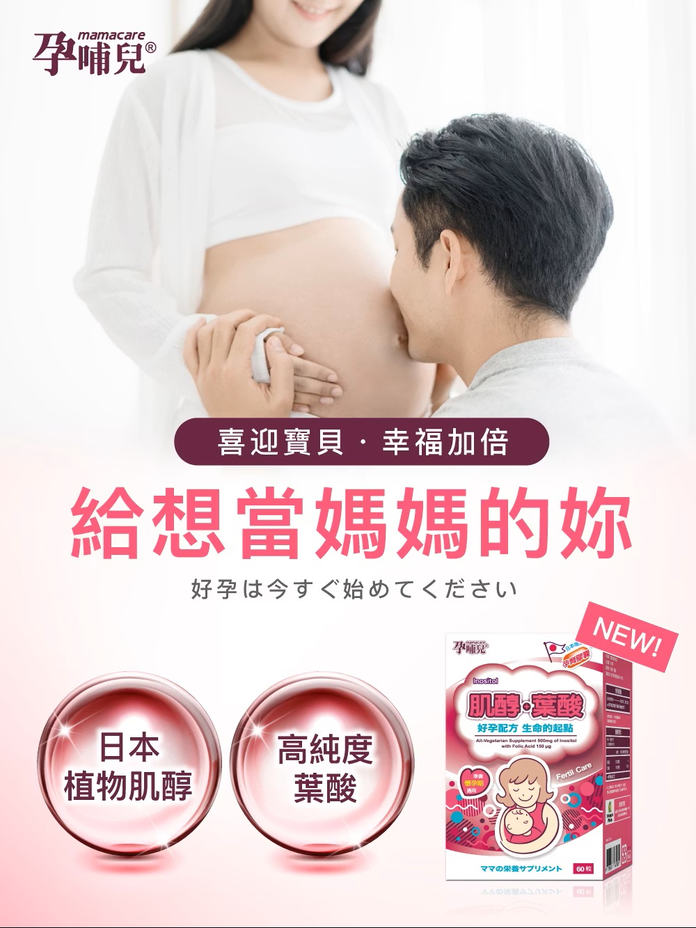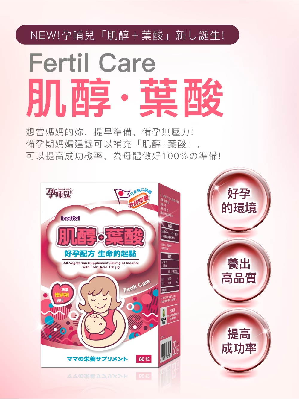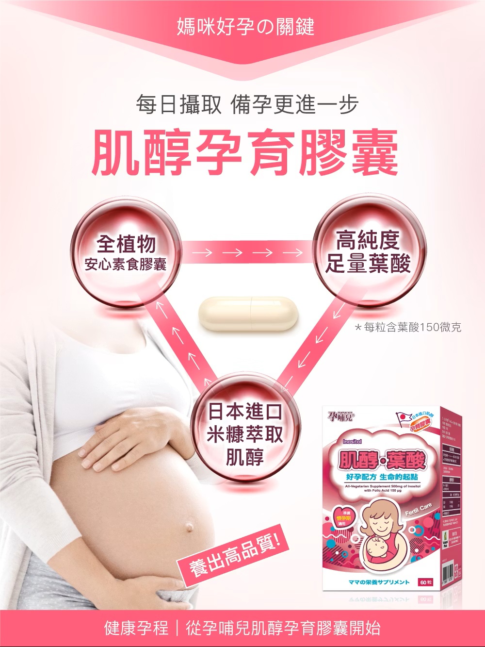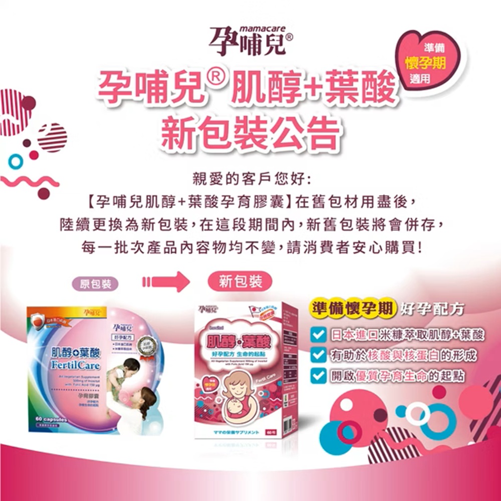 孕哺兒Ⓡ肌醇+葉酸 孕育膠囊,『準備懷孕、孕前營養備孕配方』,日本進口米糠萃取肌醇,含米糠萃取由來500mg肌醇(Inositol),與豐富葉酸有助於核酸與核蛋白的形成與胎兒的正常生長與發育,調整體質,開啟優質孕育生命的起點,為您輕鬆迎接好孕到!主要成分:肌醇、葉酸膠囊成分: 羥丙基甲基纖維素(HPMC)規格容量:劑型:膠囊。內容量:60粒。食用建議:◆生育準備期:每次1粒,每日3次。◆懷孕後請改食用孕哺兒維他命。注意事項:◆素食可食,本產品使用植物性膠囊(植物纖維HPMC)全產品皆無使用動物成分。