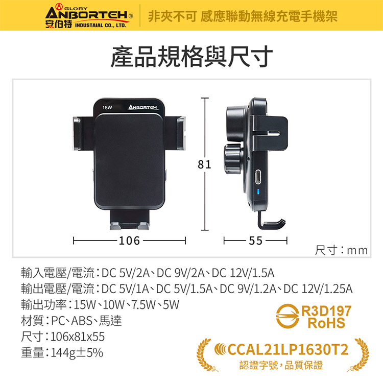 ◆特點推薦 ★支架八選一 ★認證字號R3D197 ★支援QC3.0快充 ★自動感應線圈位置 ★夾臂內扣,底托弧度設計 ★三角支撐,穩固不晃動 ★人性化按鈕位置 ◆產品介紹 ☆★☆秒速感應 一放即充☆★☆ 【安伯特】感應聯動無線充電手機架 快充技術 : 支援QC3.0快充技術 追蹤線圈 : 自動對線圈,全自動感應 夾臂內扣 : 內傾斜8度,夾手機更穩固 按鈕位置 : 手機架兩側皆有「打開按鈕」 三角支撐 : 黃金三角定律,穩固支撐 ◆商品規格 商品品名:【安伯特】感應聯動無線充電手機架 商品型號:ABT-A079 輸入電壓/電流:DC 5V/2A、DC 9V/2A、DC 12V/1.5A 輸出電壓/電流:DC 5V/1A、DC 5V/1.5A、DC 9V/1.2A、DC 12V/1.25A 輸出功率:15W、10W、7.5W、5W 商品材質:PC、ABS 商品尺寸:106x81x55mm ±5% 商品重量:144g ±5% 支援手機寬度:86mm ±5% 閉合尺寸:106x81x55mm ±5% (不含安裝支架) 張合尺寸:115x101x55mm ±5% (不含安裝支架) BSMI:R3D197 NCC:CCAL21LP1630T2 保固範圍:新品暇疵 商品產地:中國(台灣監造) ◆保固說明 ※產品一經使用無法整新賣給下一位消費者因此產品一經使用將無法重新販售,訂貨前請先確認評估,否則將以收取整新費辦理 ※我們所提供為全新產品,並提供以下保證: - 保固範圍:新品暇疵 ◆退(換)貨注意事項: 1、本商品未確定購買前嚴禁使用!否將影響您退換貨權利。 2、本商品並不提供免費試用(猶豫期並非試用期),除新品故障瑕疵外,凡經操作使用與包裝不完全造成商品損壞或污穢,將影響您退、換貨權益!猶豫期間內請妥善保護相關物件。 3、請保留原包裝袋、紙箱!退貨時請以原裝袋、紙箱包裝退回,包裝不完全造成商品損壞恕將影響您退貨權益。 4、(如有贈品)贈品隨貨品附上!遺失或損壞將影響您退貨權益。 ◆配送注意事項: 本產品係由供應商提供台灣本島(貨運一般區)免費商品運送服務。若指定配送區為離島、花東與偏遠特殊地區,將不在此(免費)服務範圍內!