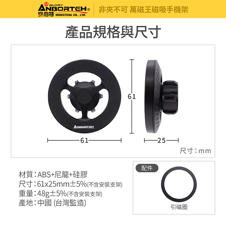 ◆特點推薦 ★支架九選一 ★24顆強力磁鐵,穩固吸附 ★橫的直的,任意調整角度 ★單手操作,輕鬆便利 ◆產品介紹 ☆★☆搭配引磁圈 吸力更強☆★☆ 【安伯特】萬磁王磁吸手機架 強力磁鐵:24顆強力磁鐵,搭配引磁圈吸力更強 輕鬆便利:單手操作,無須繁瑣固定 穩固不晃:強力磁吸鎖定重心不晃動 自由旋轉:橫的直的,可任意調整角 ◆商品規格 品名:【安伯特】萬磁王磁吸手機架 型號:ABT-A171 材質:ABS+尼龍+硅膠 尺寸:61x25mm ±5% 重量:48g ±5% 保固範圍:新品暇疵 保固期限:非人為因素下,主體保固一年 產地:中國(台灣監造) ◆保固說明 ※產品一經使用無法整新賣給下一位消費者因此產品一經使用將無法重新販售,訂貨前請先確認評估,否則將以收取整新費辦理 ※我們所提供為全新產品,並提供以下保證: - 保固範圍:新品暇疵 - 保固期限:非人為因素下,主體保固一年 ◆退(換)貨注意事項: 1、本商品未確定購買前嚴禁使用!否將影響您退換貨權利。 2、本商品並不提供免費試用(猶豫期並非試用期),除新品故障瑕疵外,凡經操作使用與包裝不完全造成商品損壞或污穢,將影響您退、換貨權益!猶豫期間內請妥善保護相關物件。 3、請保留原包裝袋、紙箱!退貨時請以原裝袋、紙箱包裝退回,包裝不完全造成商品損壞恕將影響您退貨權益。 4、(如有贈品)贈品隨貨品附上!遺失或損壞將影響您退貨權益。 ◆配送注意事項: 本產品係由供應商提供台灣本島(貨運一般區)免費商品運送服務。若指定配送區為離島、花東與偏遠特殊地區,將不在此(免費)服務範圍內!