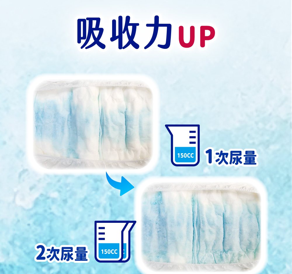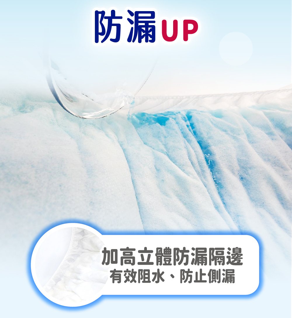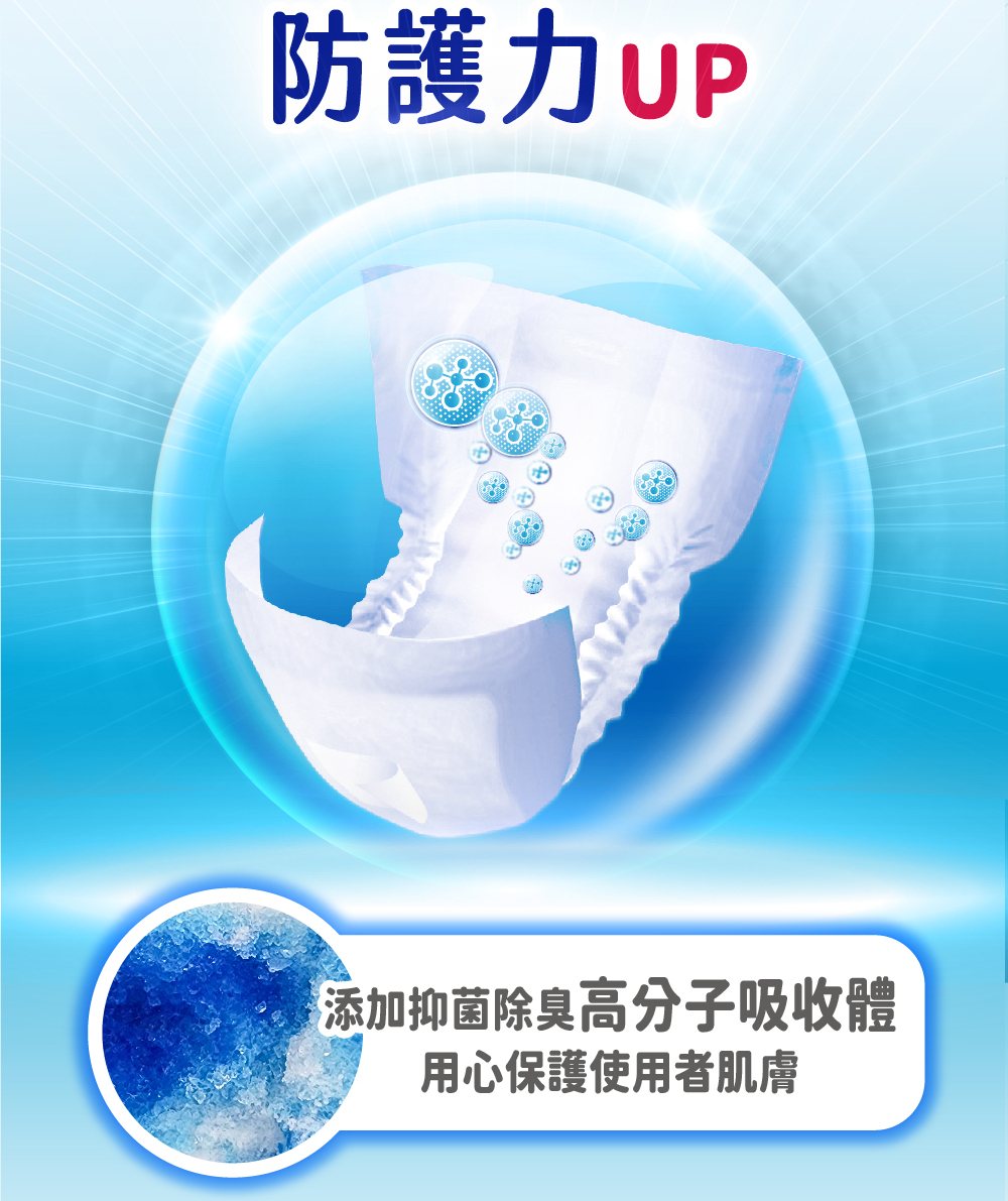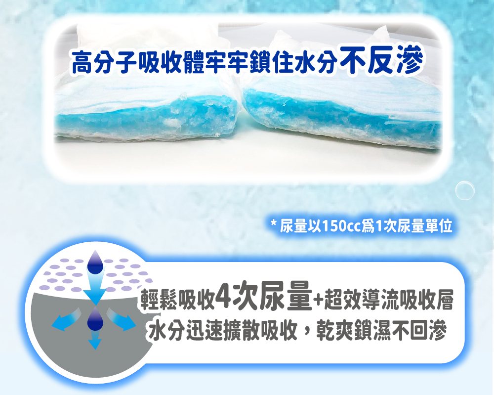 •水份迅速向下擴散吸收,有效鎖水不回滲。•超效導流吸收層,快速導出尿液,乾爽不回滲•強化背膠固定設計,防止滑動