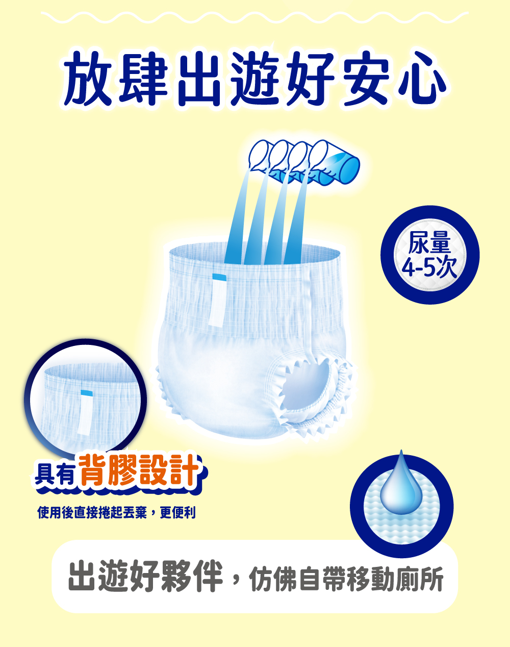 •新抑菌高分子,抑菌防臭•像內褲一樣,輕薄好穿脫•彩色辨識腰圍•具有背膠設計•高吸收量,長時間外出好方便•立體防漏隔邊,防止尿便外流