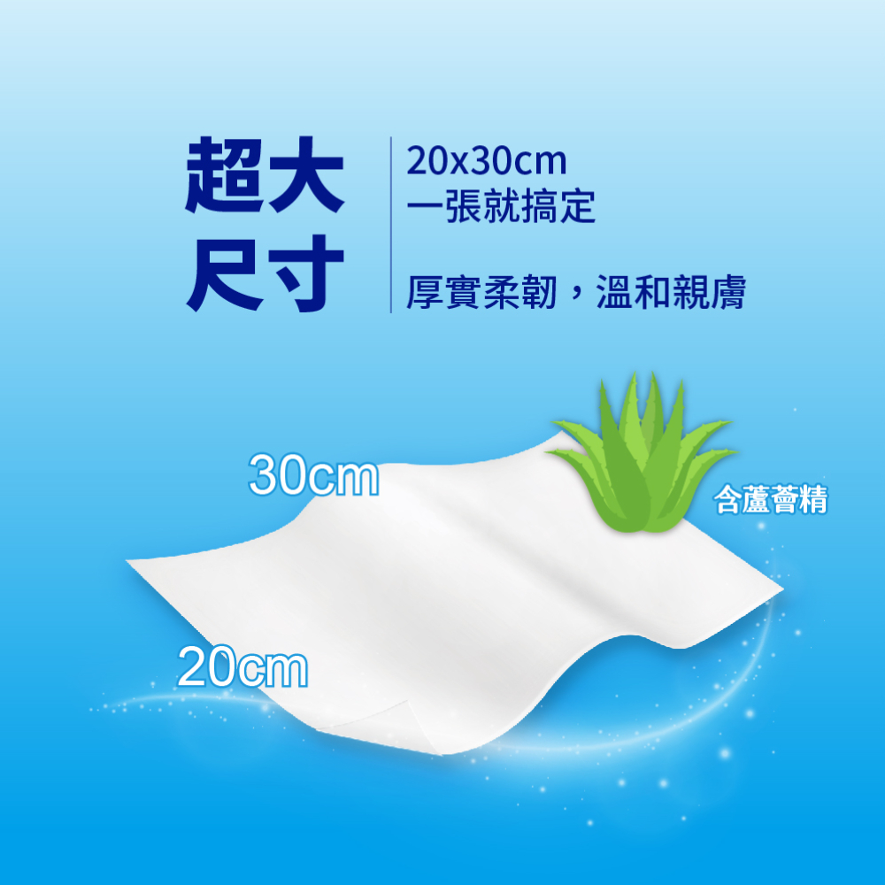 •升級加蓋版,水份不流失•20x30cm 超大尺寸,1片可抵2片•加大加厚,柔軟舒適•含蘆薈精,滋潤肌膚•不含酒精、香料等,親膚保護