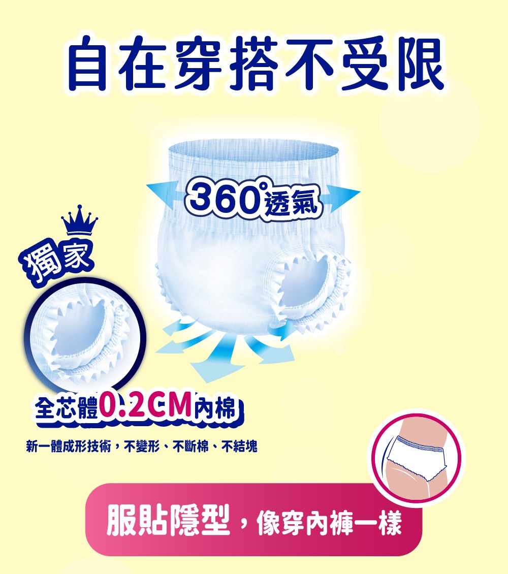 •0.2cm吸收體,更薄更貼身,服貼於臀部•透氣不織布,乾爽舒適•用顏色線條區分前後,輕鬆穿•高4cm防漏隔邊,阻擋外流•360度環繞臀部及腰圍,安心防漏