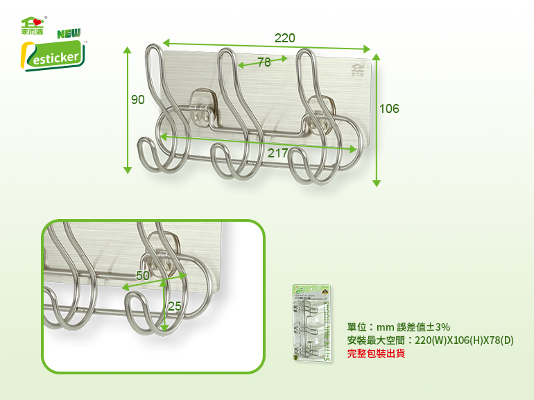 品名:家而適S型衣物掛勾架(3支6勾)材質:鍍鉻鋼線、強黏無痕膠、PP、PC塑膠產地:台灣一入裝含:S型6勾掛架X1、標準雙勾強力貼膠片X1、無痕輔助膠片X1、承重保固卡X1膠片設計承重:SGS檢驗15KG 鑑驗編號:M423756安全承重:6KG以下