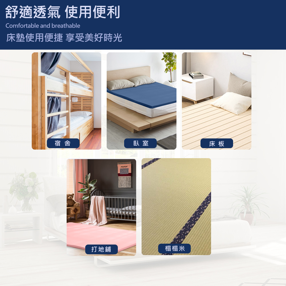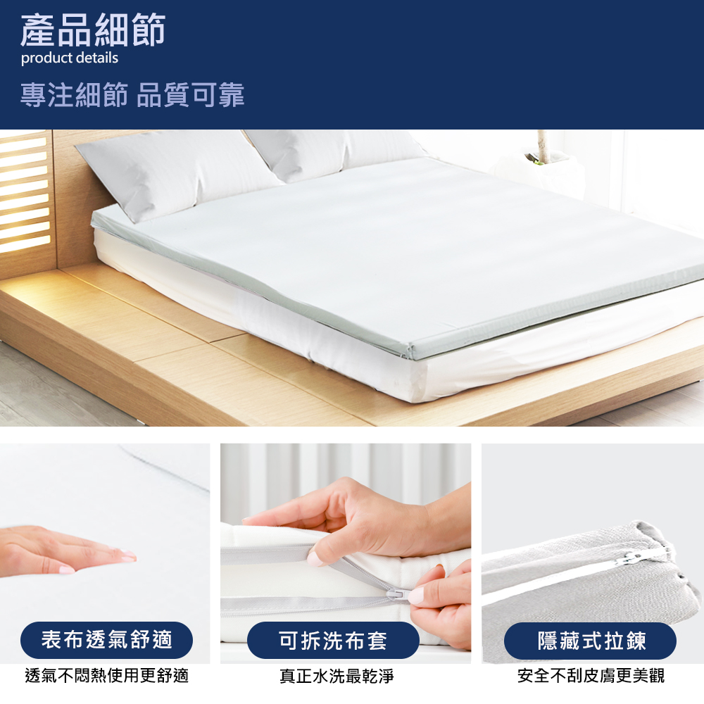 內容/規格:5CM雙人-5x6.2尺 (152 x 188±2cm)表布:100% Polyester (3M防潑水技術舒柔布) 填充物:100%聚酯纖維 (高密度記憶泡棉)(含竹碳纖維) 床墊套洗滌方式:可水洗/不可烘乾/不可漂白/懸掛晾乾/不可熨燙 原產地:台灣精製