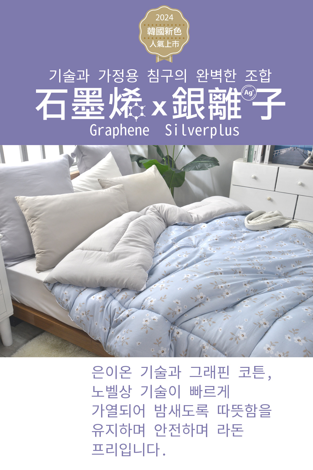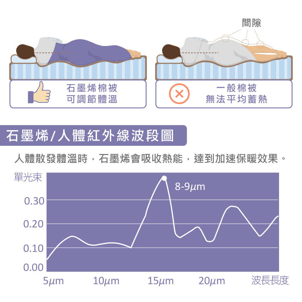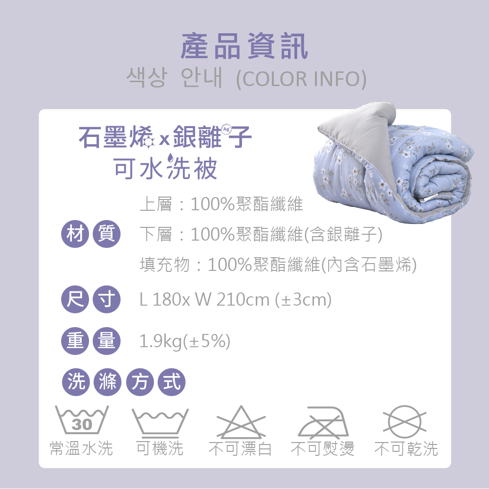 快速傳導釋熱,舒爽透氣【產品規格】大小:雙人材質:石墨稀、聚酯纖維尺寸:180x210±5%重量:1.9kg±5%產地:中國製造(台灣監製)表布材質:上層:100%聚酯纖維下層:100%聚酯纖維(含銀離子)填充物:100%聚酯纖維(內含石墨烯)