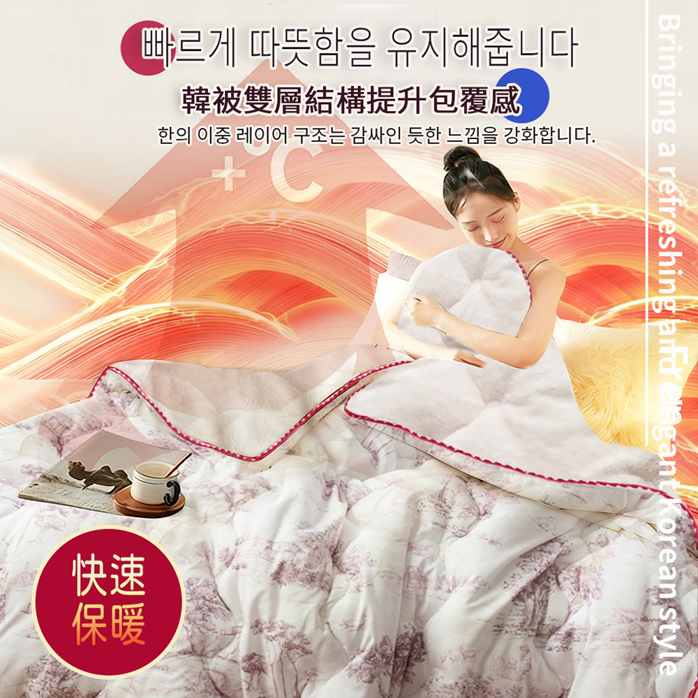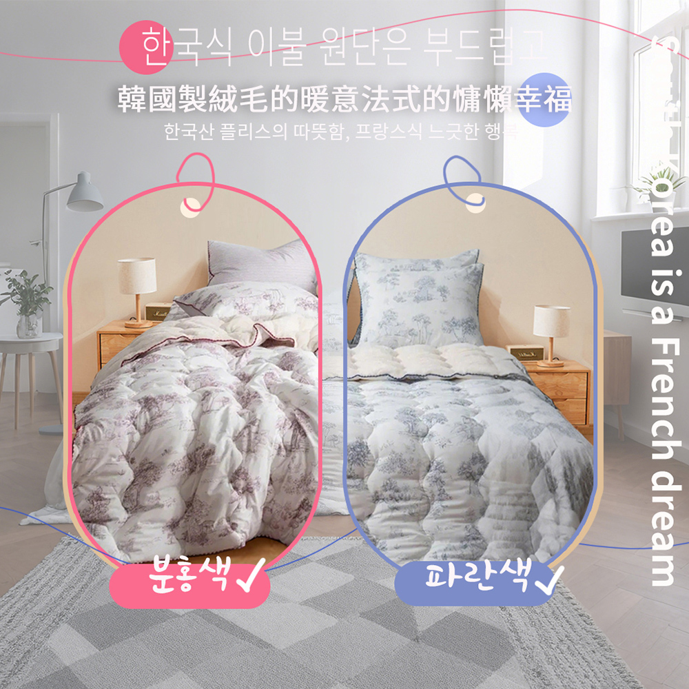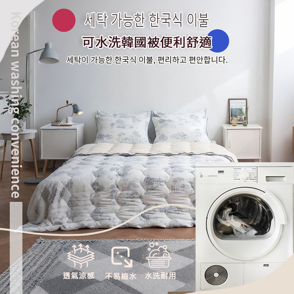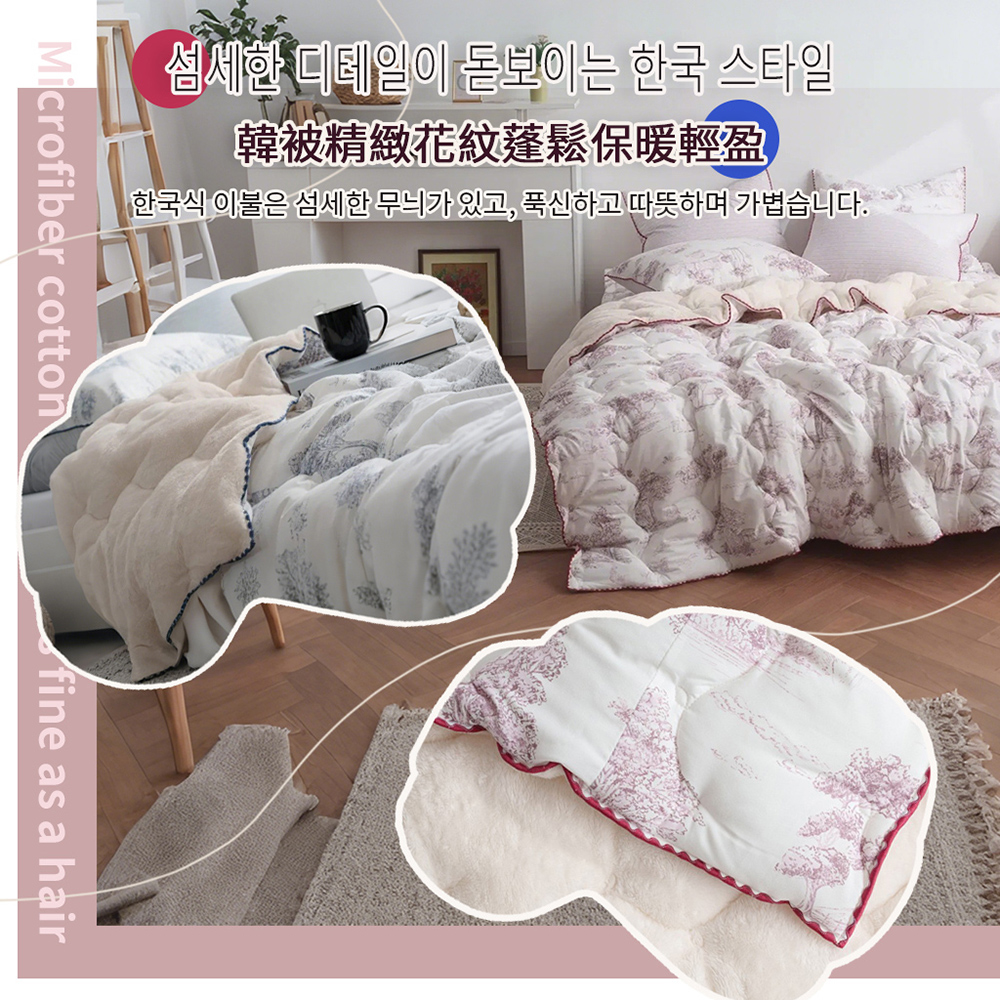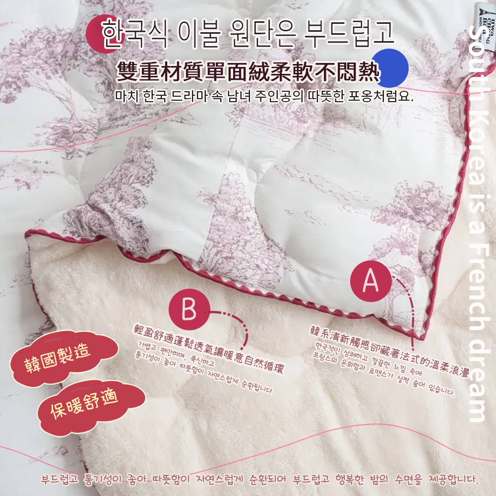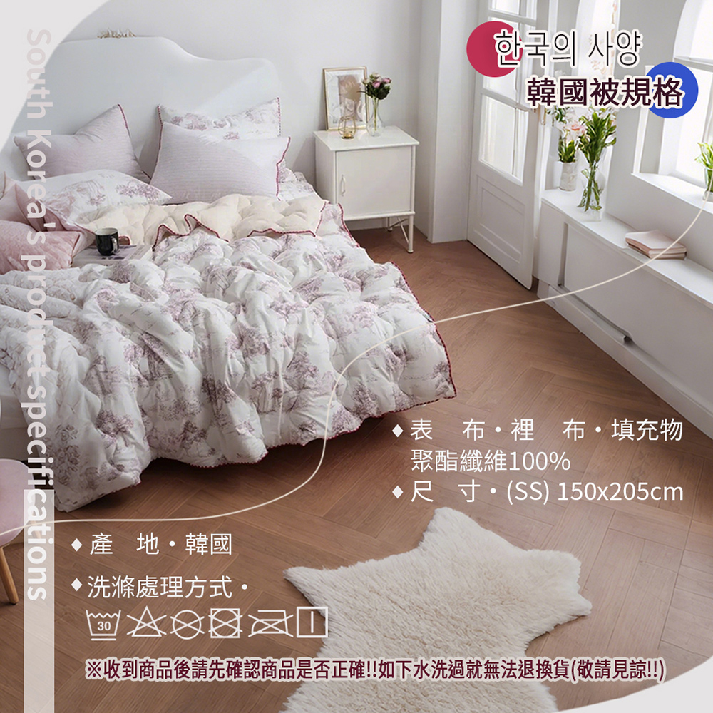 表布材質:(圖案面)聚酯纖維100%裡布材質:(素色毛絨面)5mm毛絨超細纖維100%填充物:聚酯纖纖維100%(玉米鬚纖維)尺寸/重量:150X205CM (±5cm)/ 2KG產地:韓國洗滌處理方式·水溫不可超過30*C/不可漂白/不可乾洗/不可烘乾/不可燙熨