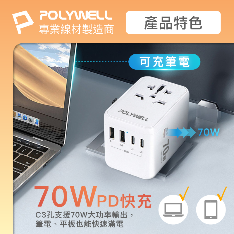 【70W快充輸出】Type-C(C3) 單孔最高70W輸出,筆電、平板、手機皆可快速充電不延誤。
