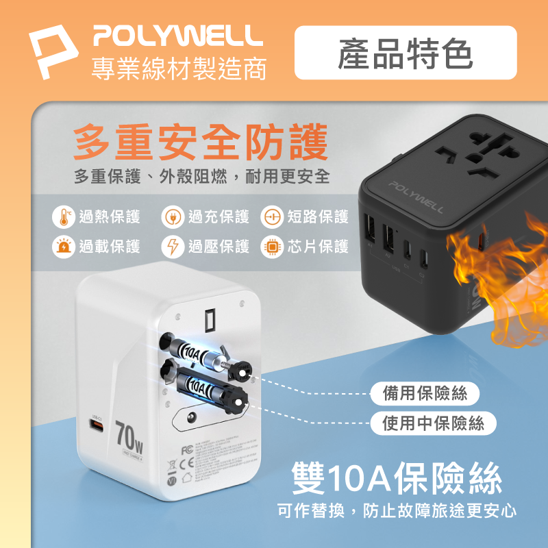 【多重安全防護】採防火材質並內建雙10A保險絲,防過載、過熱、短路等保護機制,充電更安心。