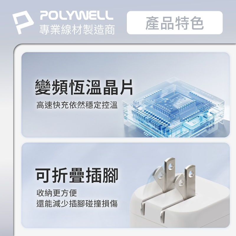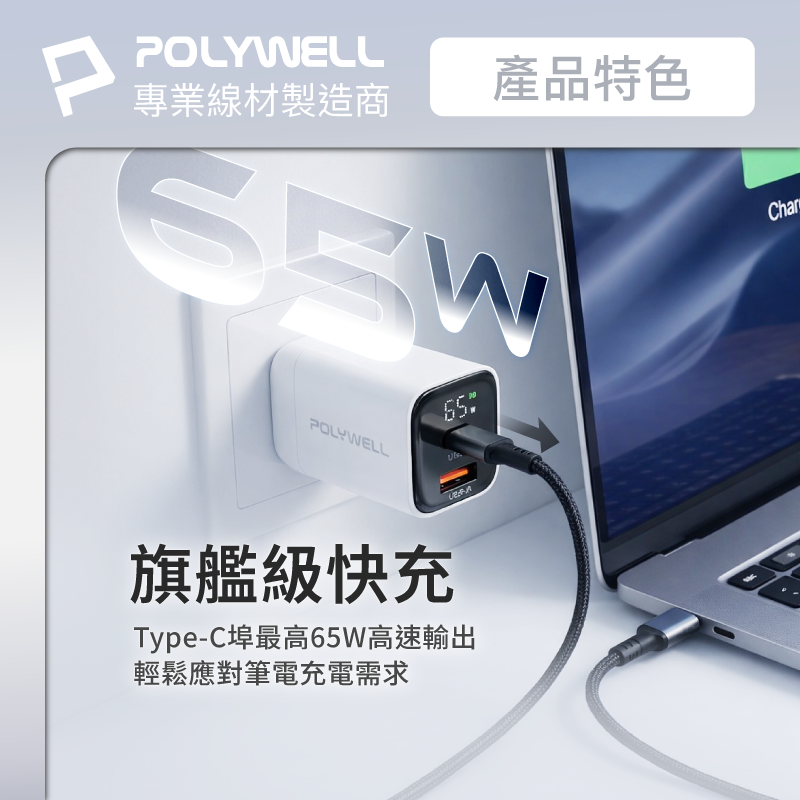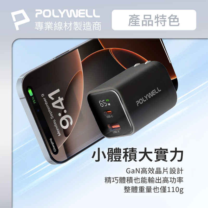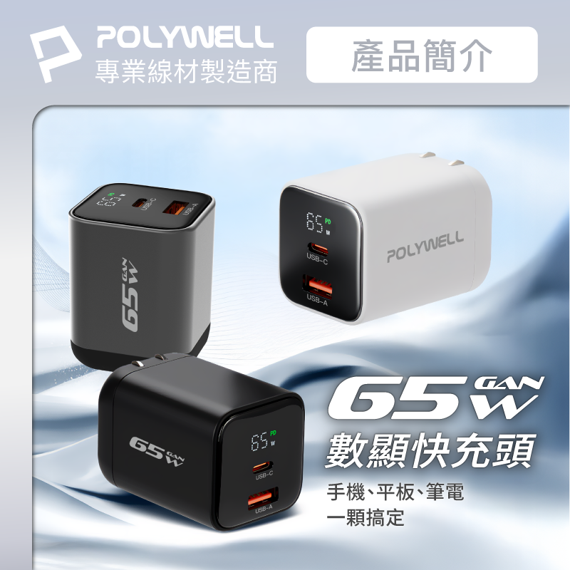 ◎ 產品:POLYWELL 65W數顯雙孔PD快充頭