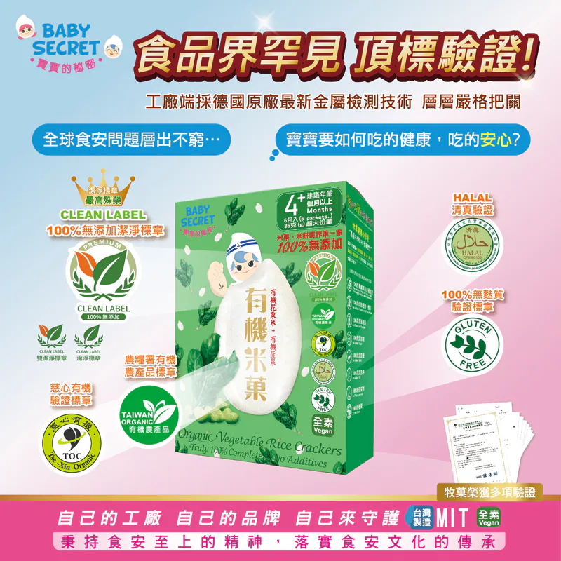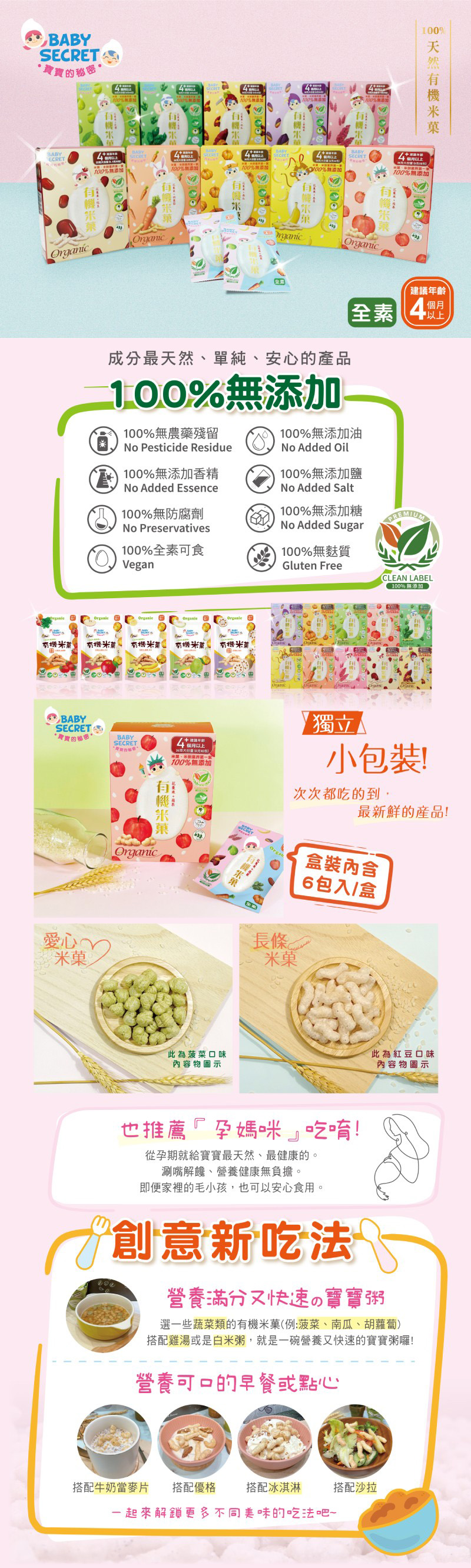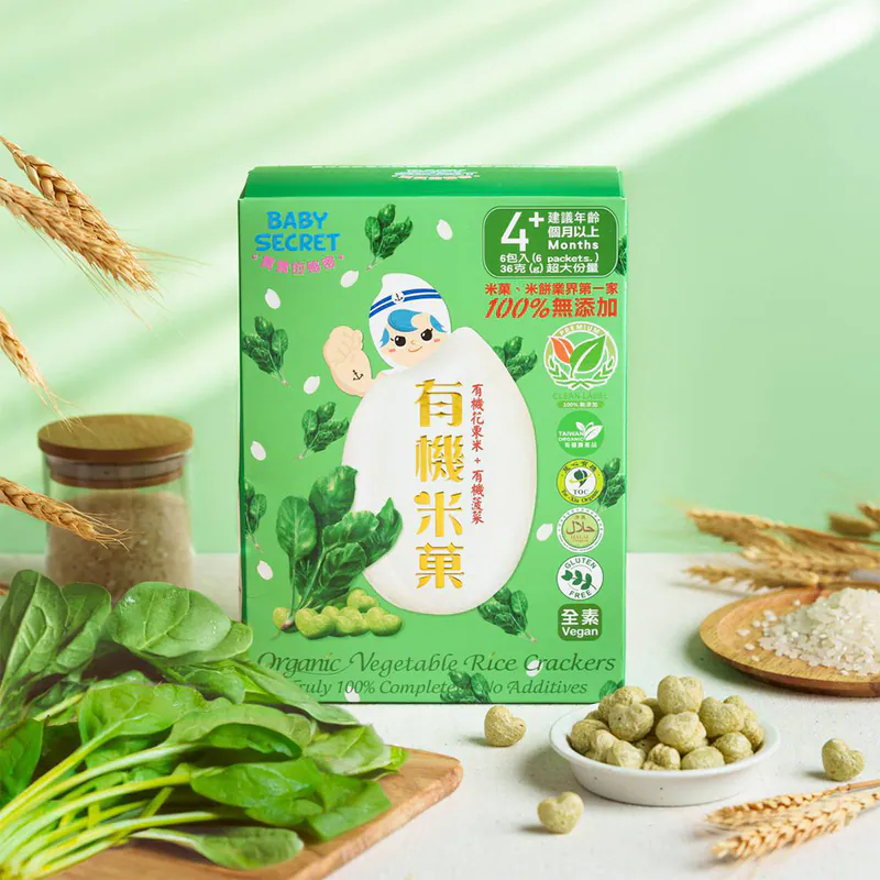 米與蔬菓的完美結合,滿滿新鮮的蔬菓,讓你看的見也吃的到。✦ 1盒6包入|36g/單盒✦ 100%無添加‧100%無麩質‧素食可食✦ 逐批送驗有機原料,確保無農殘。✦ 獨家愛心型,口感軟綿入口易化。✦ 菠菜含有豐富β-胡蘿蔔素、鐵、鉀、鎂、鈣、葉黃素、維生素A、C、E等營養素,是相當優良健康的好食物。