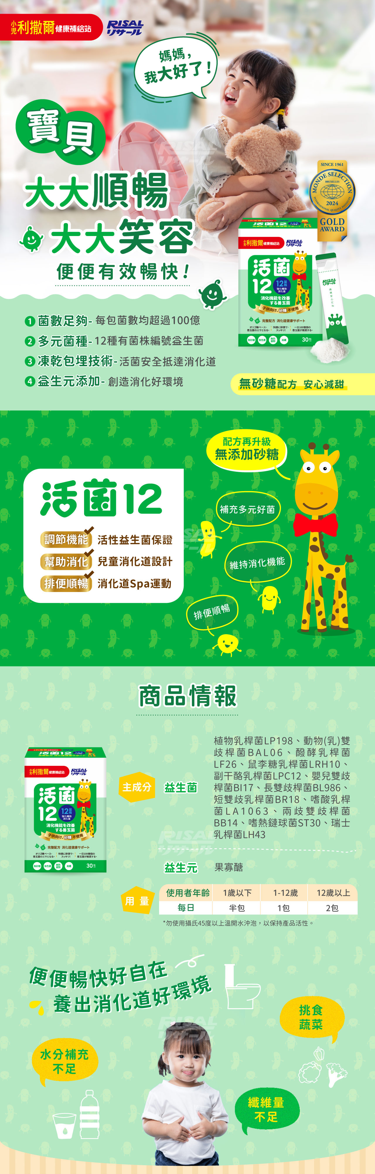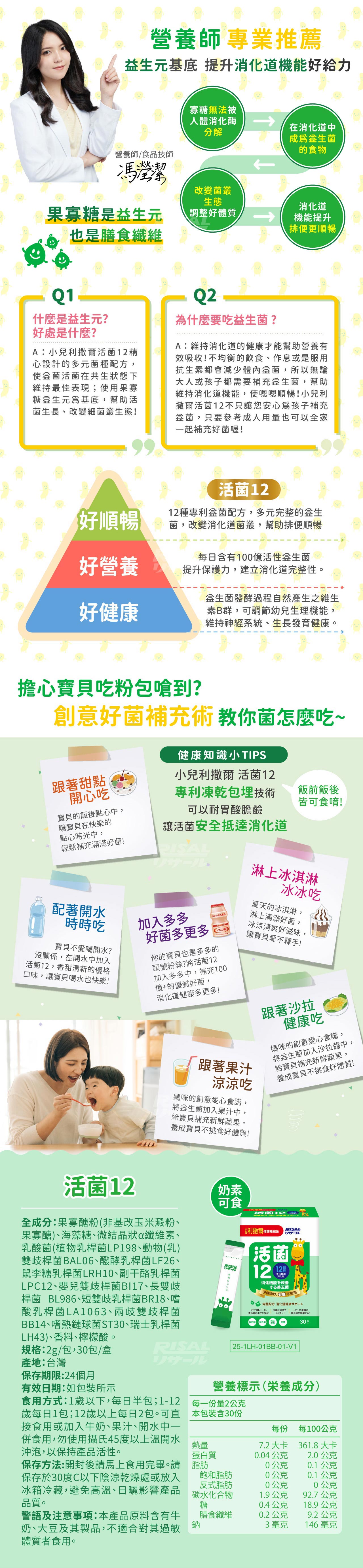 全成分:果寡醣粉(非基改玉米澱粉、果寡醣)、海藻糖、微結晶狀 α- 纖維素、乳酸菌( 植物乳桿菌 (Lactobacillus plantarum LP198) 、 動物(乳)雙歧桿菌 (Bifidobacterium animalis subsp. lactis BAL06)、 醱酵乳 桿菌 (Lactobacillus fermentum LF26) 、鼠李糖乳桿菌 (Lactobacillus rhamnosus LRH10) 、 副干酪乳桿菌 (Lactobacillus paracasei LPC12) 、 嬰兒雙歧桿菌 Bifidobacterium longum subsp. Infantis BI17) 、 長雙歧 桿菌 Bifidobacterium longum BL986) 、 短雙歧乳桿菌 Bifidobacterium breve BR18) 、 嗜酸乳桿菌 (Lactobacillus acidophilus LA1063 、 兩歧雙歧桿菌 Bifidobacterium bifidum BB14) 、 嗜熱鏈球菌 (Streptococcus thermophilus ST30) 、瑞士乳桿菌 (Lactobacillus helveticus LH43)、 香料、 檸檬酸 。
