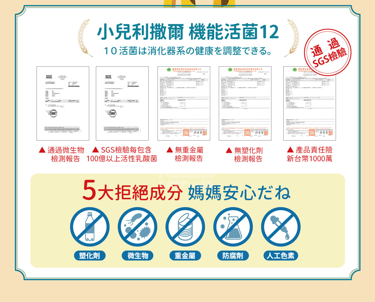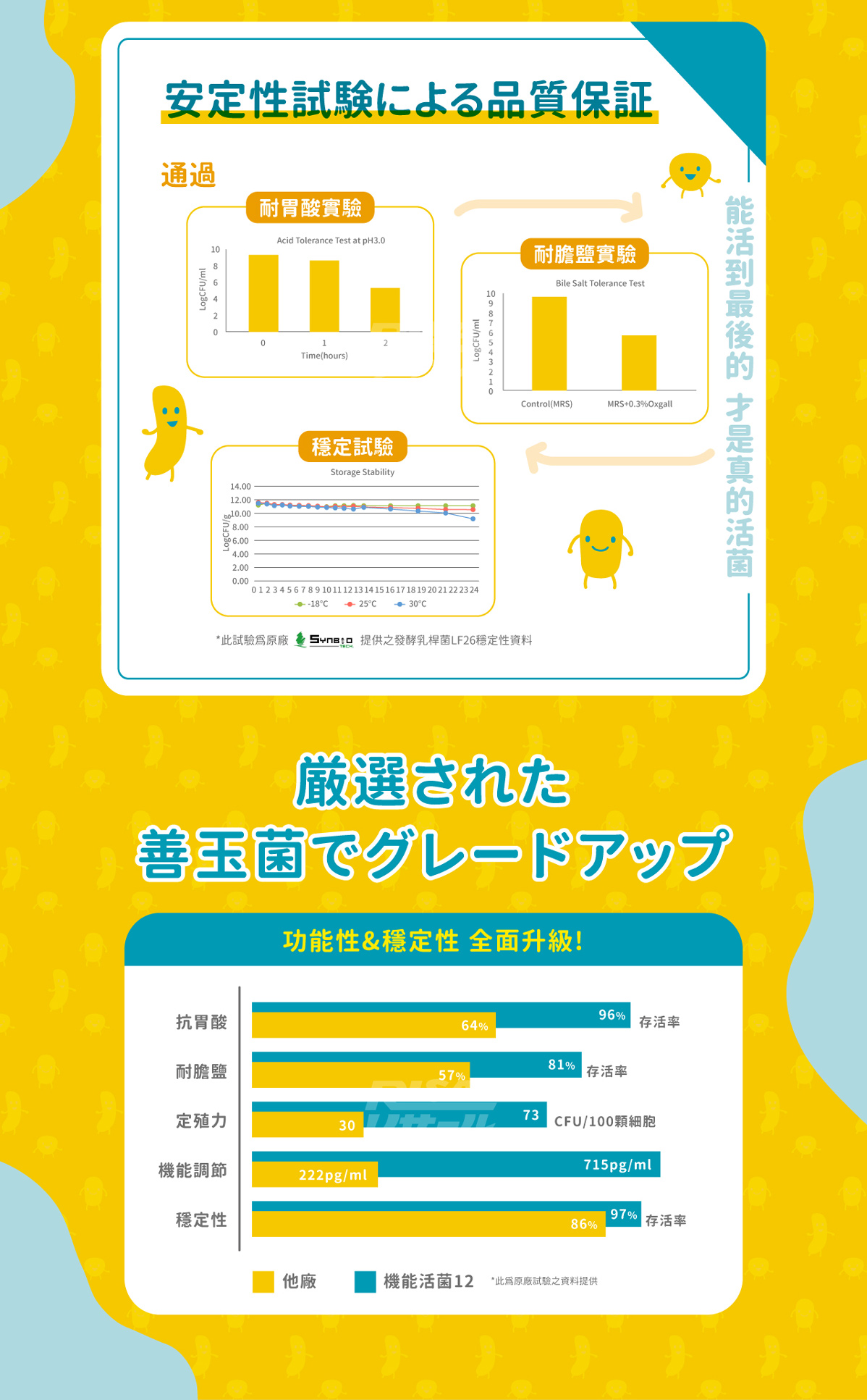 全成分:果寡醣粉(非基改玉米澱粉、果寡醣)、海藻糖、微結晶狀α-纖維素、乳酸菌(凝乳芽孢桿菌(Bacillus coagulans BC30)、植物乳桿菌(Lactobacillus plantarum LP198)、醱酵乳桿菌(Lactobacillus fermentum LF26)、 鼠李糖乳桿菌(Lactobacillus rhamnosus LRH10)、副干酪乳桿菌(Lactobacillus paracasei LPC12)、 動物(乳)雙歧桿菌(Bifidobacterium animalis subsp. lactis BAL06)、鼠李糖乳桿菌(Lactobacillus rhamnosus LRH113)、 植物乳桿菌(Lactobacillus plantarum LP28)、長雙歧桿菌(Bifidobacterium longum BL986)、 嗜酸乳桿菌(Lactobacillus acidophilus LA1063)、嗜熱鏈球菌(Streptococcus thermophilus ST30)、 瑞士乳桿菌(Lactobacillus helveticus LH43))、菊糖、乳糖酶、檸檬酸、香料。