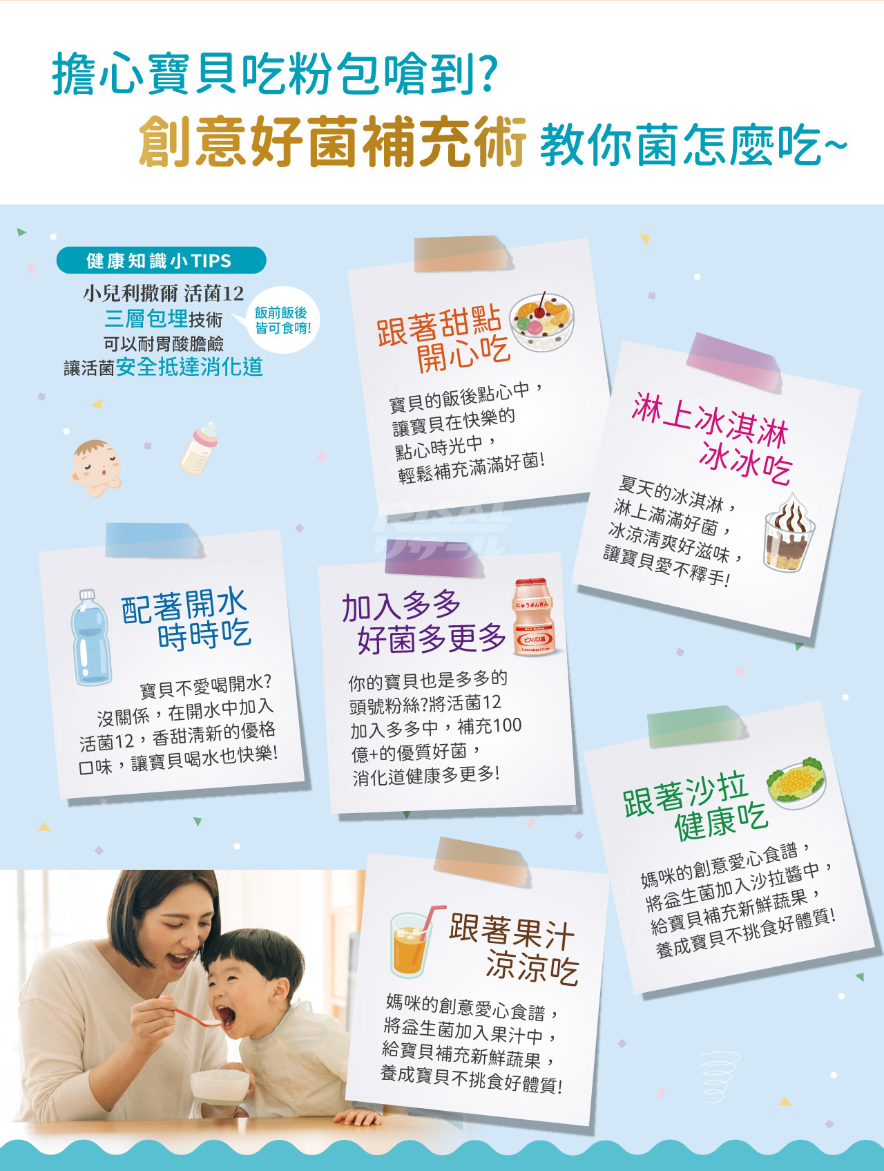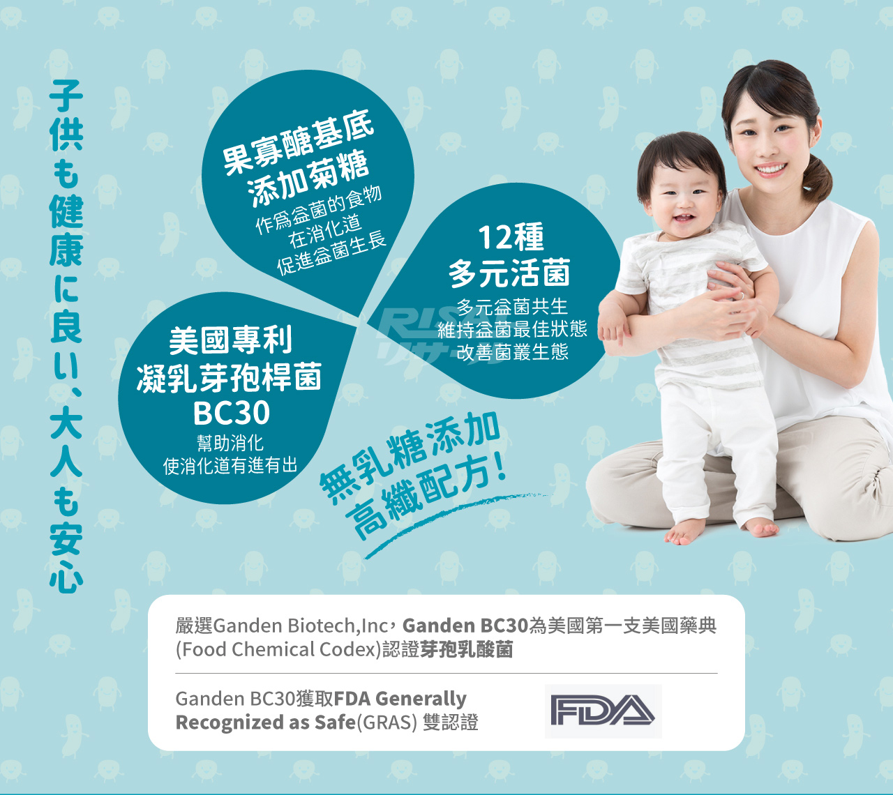 ● 含美國專利凝乳芽孢乳酸菌BC30等12種多元完整益生菌,改變消化道菌叢,幫助排便順暢。●以益生元為基底的無砂糖配方,維持消化道機能,減少精製糖添加,甜度低、減少負擔。●選用專利包埋技術菌種配方(專利號:M603759),通過胃酸膽鹼試驗,幫助益菌安全抵達腸道,維持消化道健康。● 乳糖酶添加配方,幫助消化、維持生理機能。○無砂糖、無色素、無防腐劑、高纖。