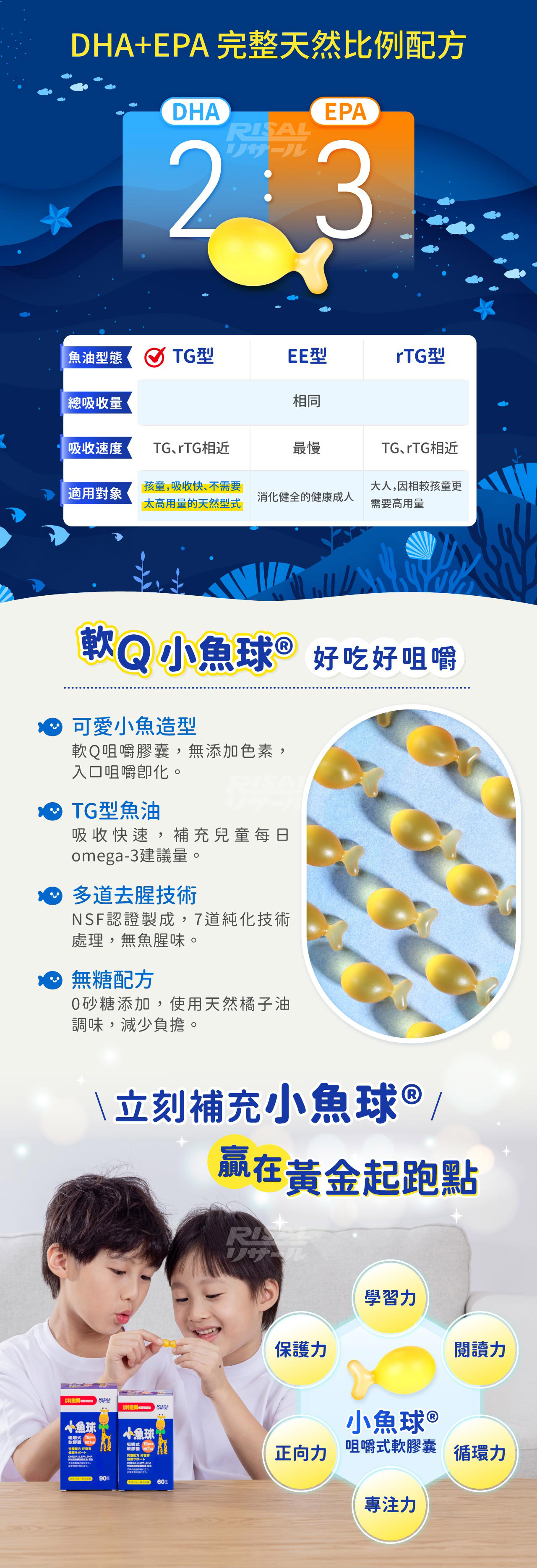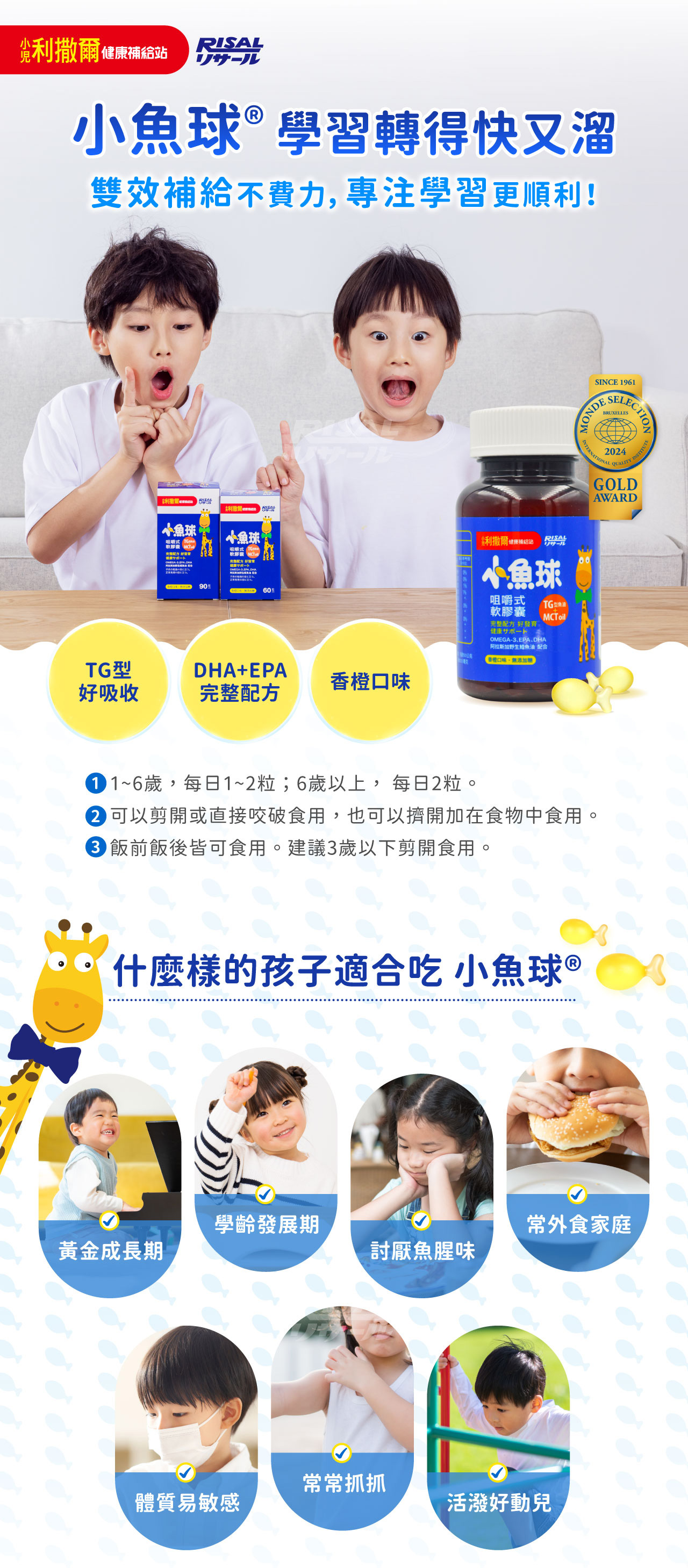● 完整Omega-3營養-每顆含400mg濃縮鱈魚油(EPA 100mg與DHA 66 mg)。● 嚴選野生魚油-經MSC認證之美國阿拉斯加野生鱈魚油,環保永續漁業無汙染。● 去腥味技術-NSF認證製程,7道純化技術處理,無魚腥味。● 好吸收配方-濃縮TG型鱈魚油與MCT oil搭配,適合人體吸收。● 專為兒童設計-軟Q可咀嚼的小魚形外皮,無人工色素、人工香料。
