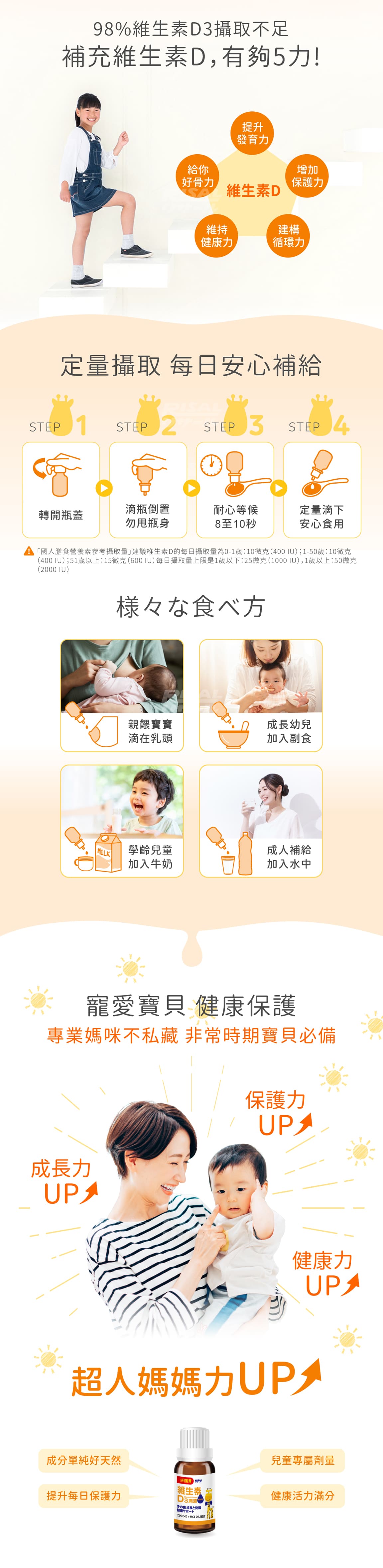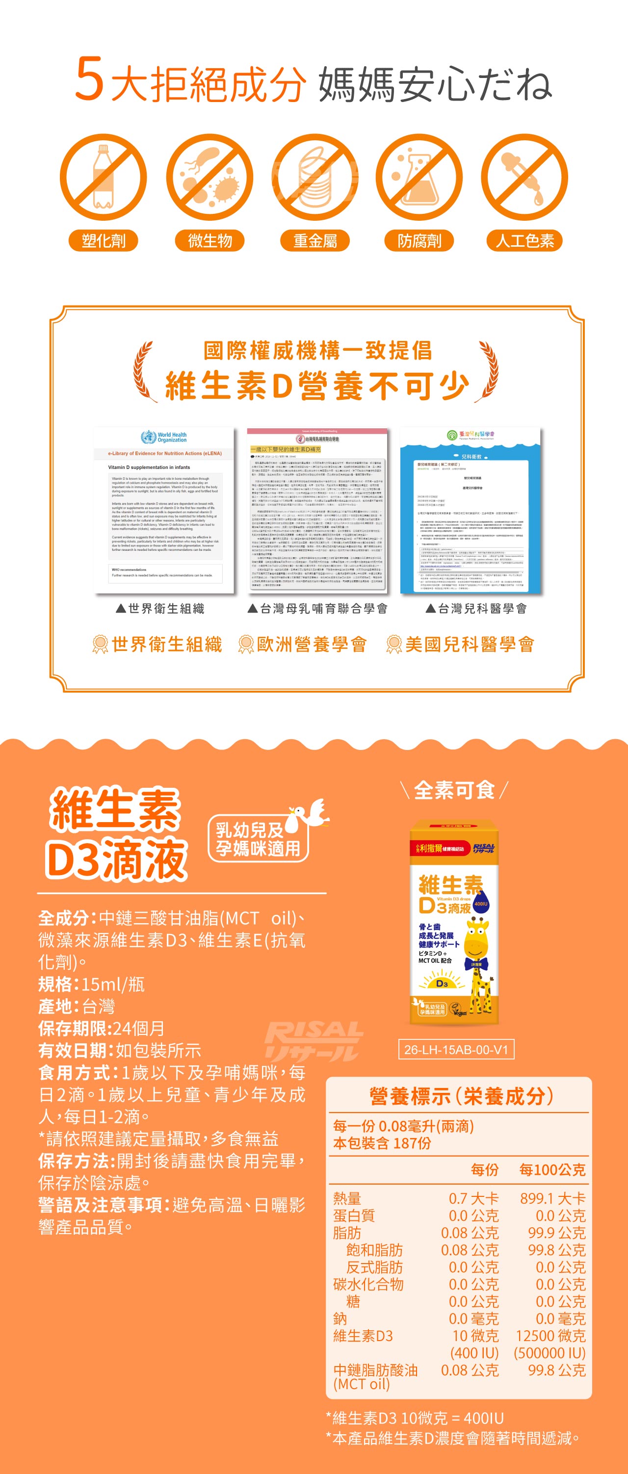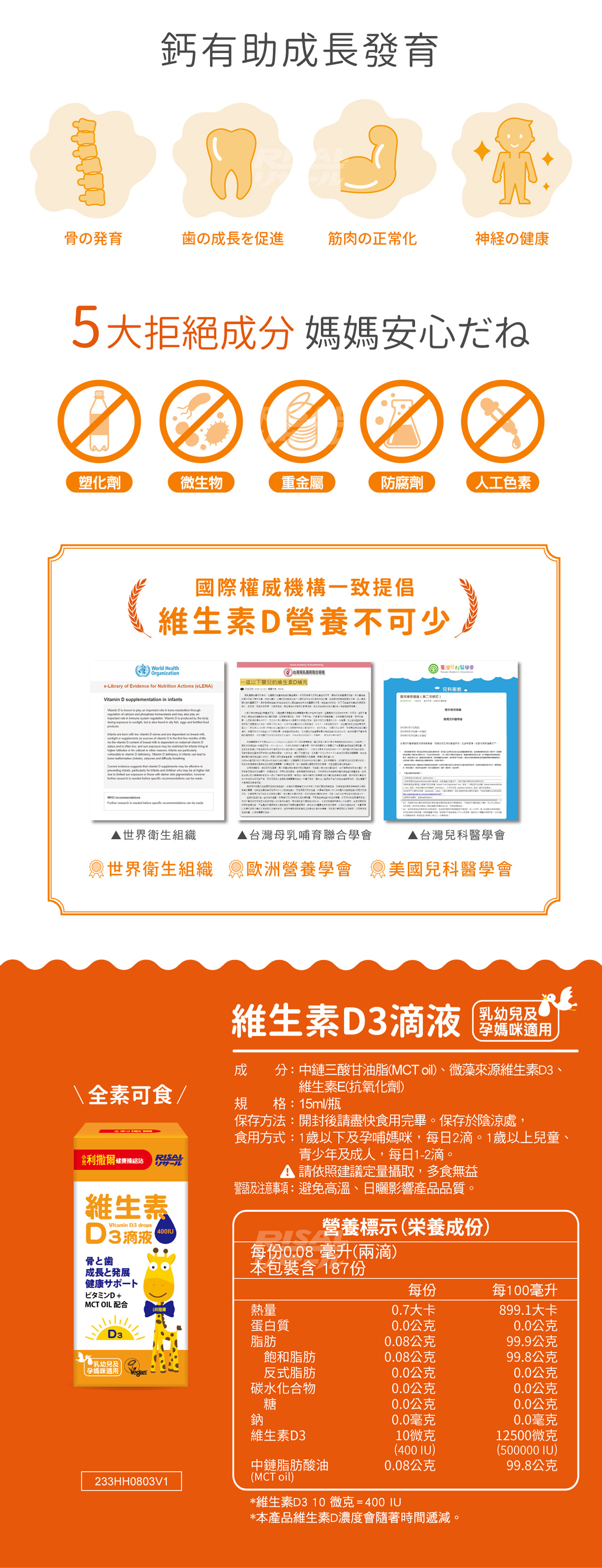 營養標示 (栄養成份) 每份 0.08 毫升(兩滴) 本包裝含 187份 每份 每100毫升 熱量 0.7 大卡 899.1 大卡 蛋白質 0.0 公克 0.0 公克 脂肪 0.08 公克 99.9 公克 飽和脂肪 0.08 公克 99.8 公克 反式脂肪 0.0 公克 0.0 公克 碳水化合物 0.0 公克 0.0 公克 糖 0.0 公克 0.0 公克 鈉 0.0 毫克 0.0 毫克 維生素D3 10 微克 12500 微克 (400IU) (500000IU) 中鏈脂肪酸油 0.08公克 99.8公克 *維生素D3 10 微克= 400 IU *本產品維生素D濃度會隨著時間遞減。