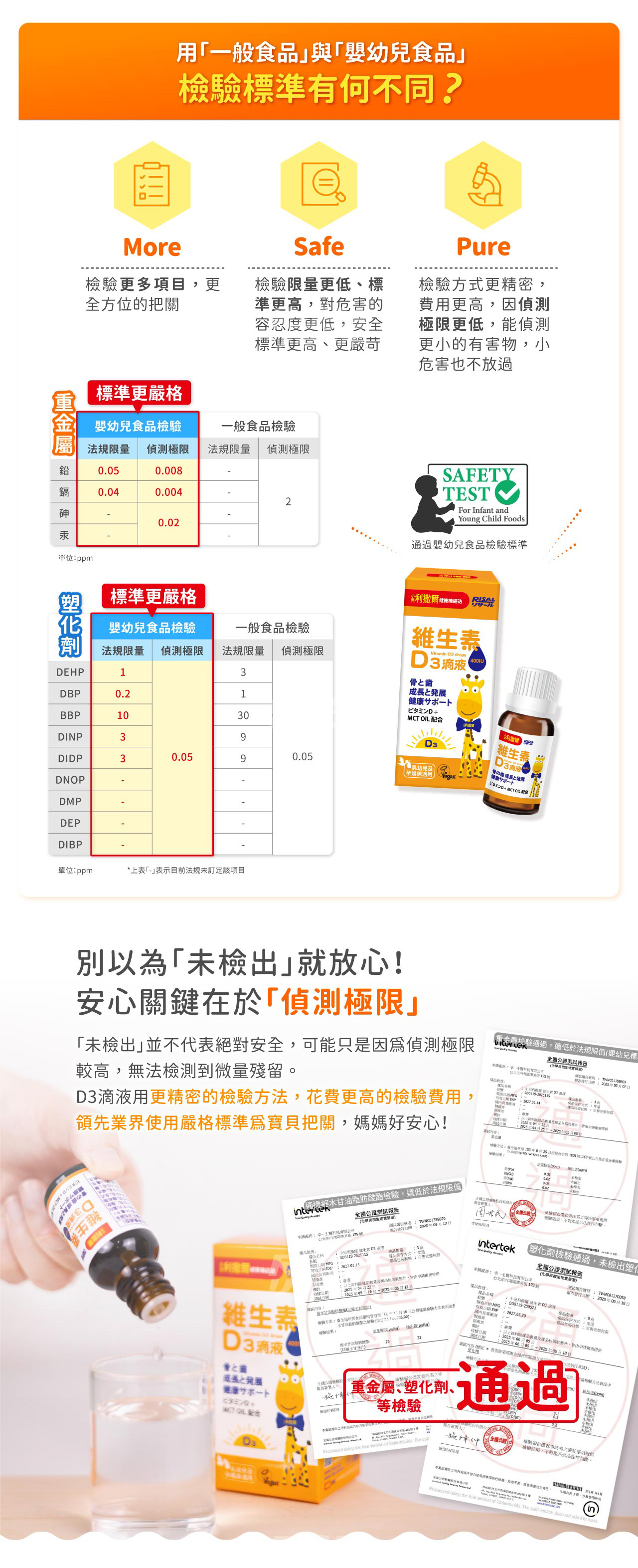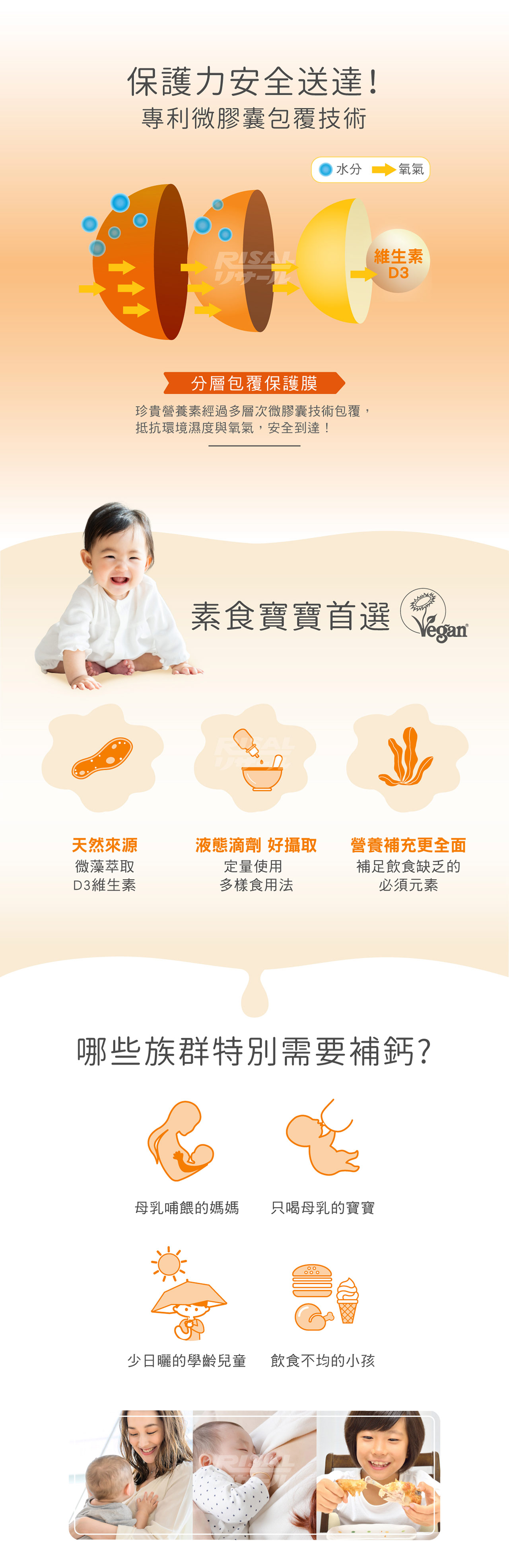 全成分(原材料):中鏈三酸甘油酯(MCT oil)、微藻來源維生素D3、維生素E(抗氧化劑)