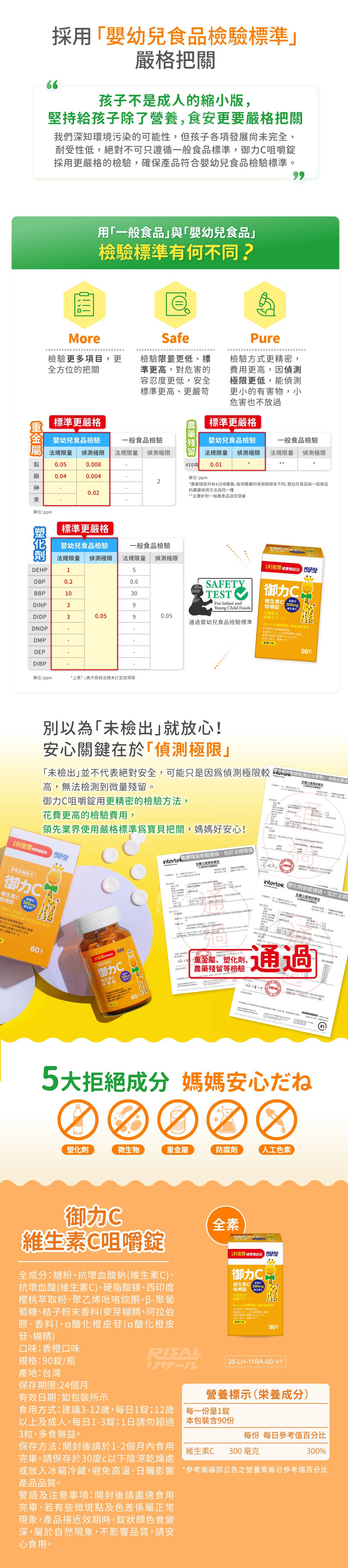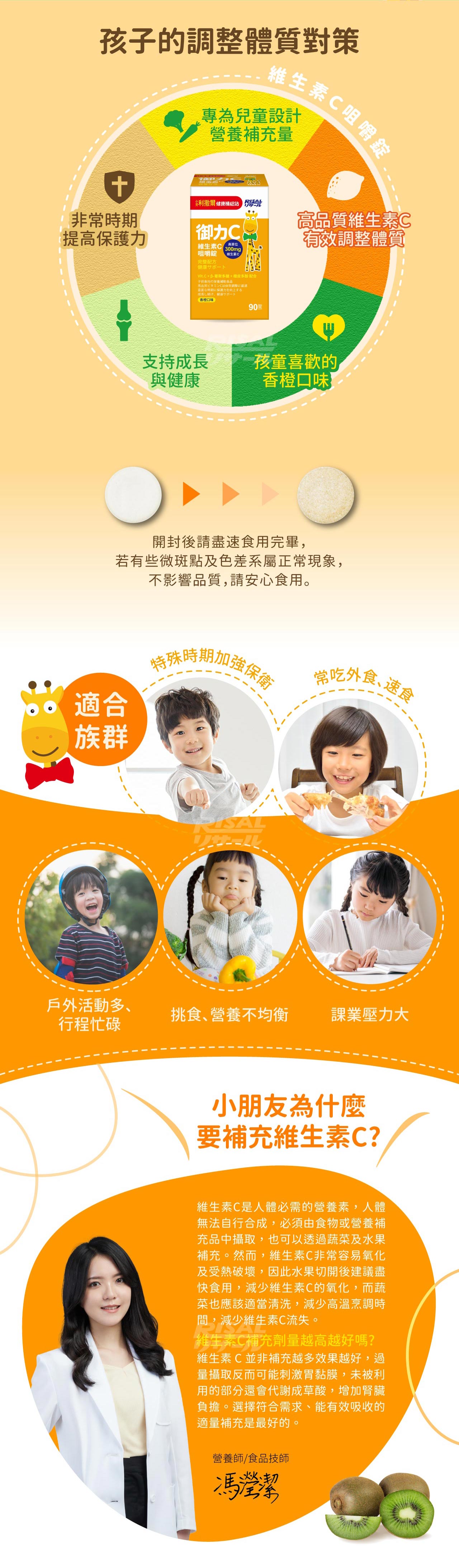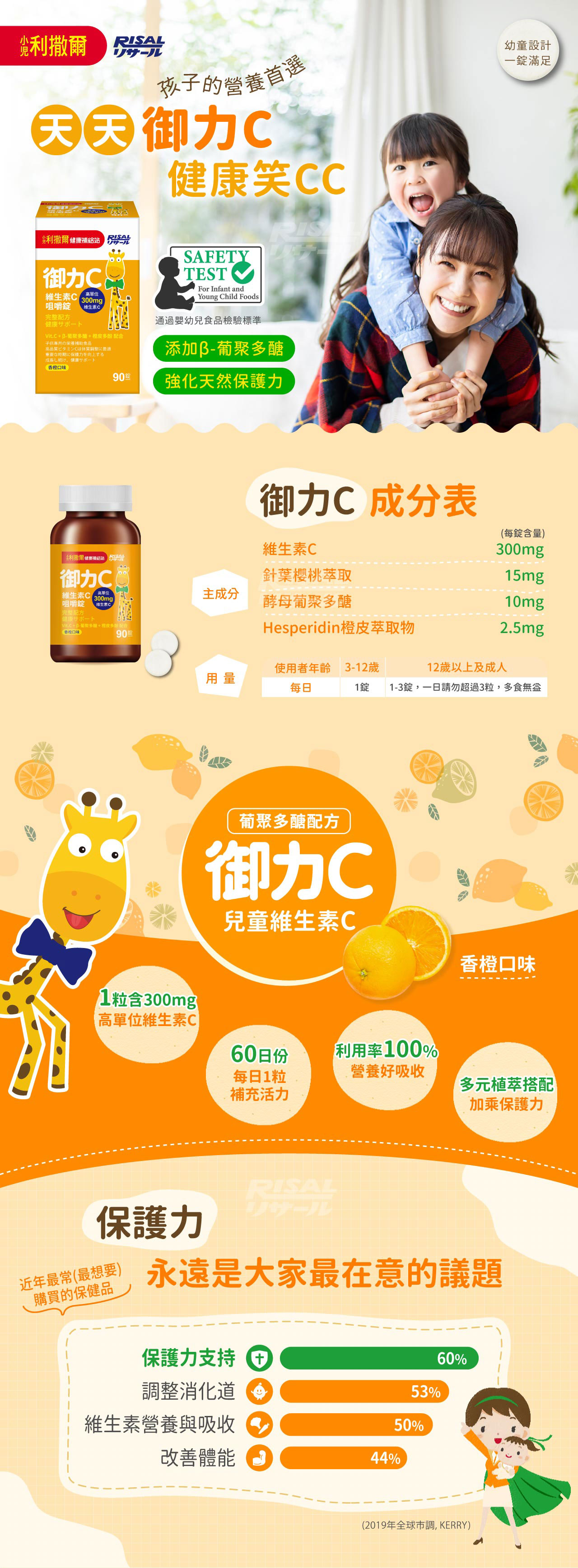 完整配方 健康サポート˙高單位維生素C'、兒童設計300mg維生素C,具抗氧化作用,維持每日健康活力˙橙皮多酚萃取,天然柑橘萃取,保持維生素C利用率,促進循環代謝力˙酵母葡聚多醣,高活性β1,3/1,6-葡聚多醣,特殊活化萃取技術,提供天然保護力˙添加針葉櫻桃萃取,珍貴櫻桃植萃精華,含豐富衛生素C與天然營養,延續保護力˙香橙果汁粉調味,不添加防腐劑、色素及蔗糖素