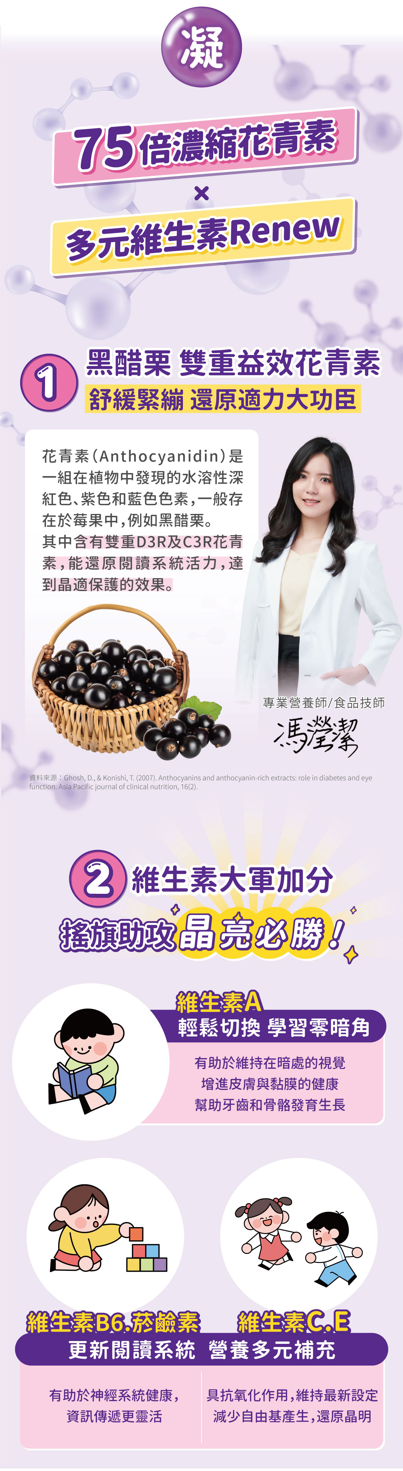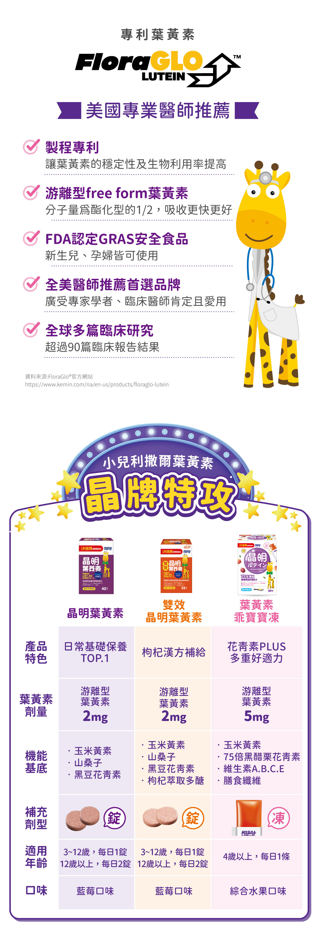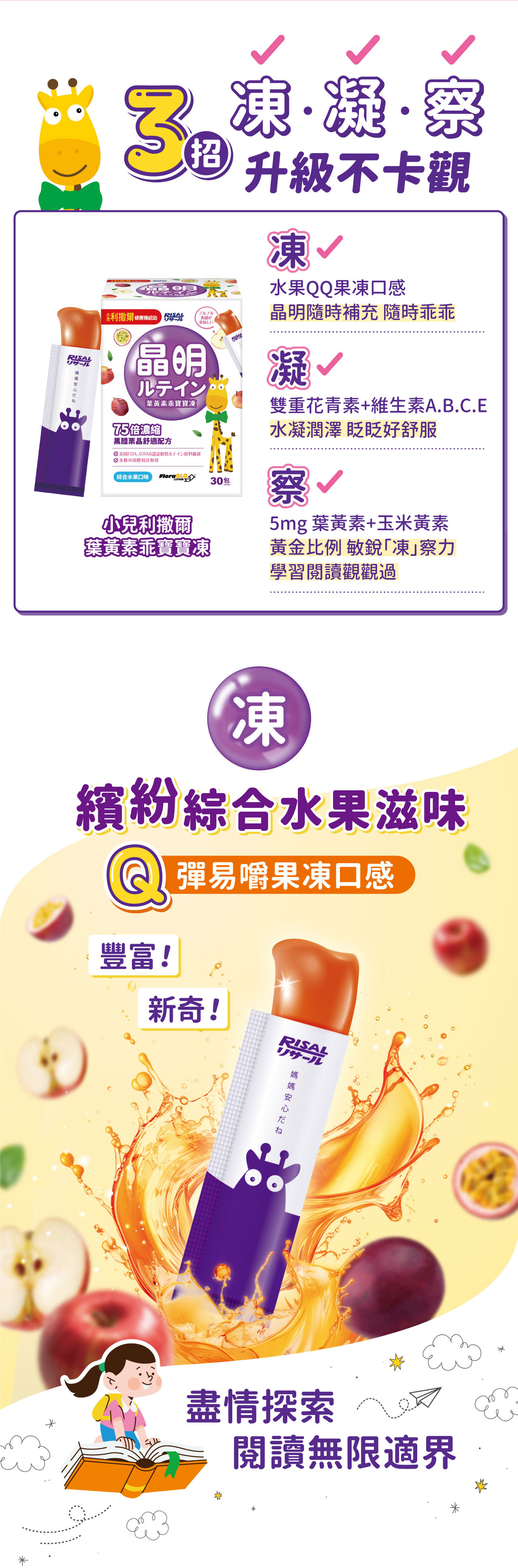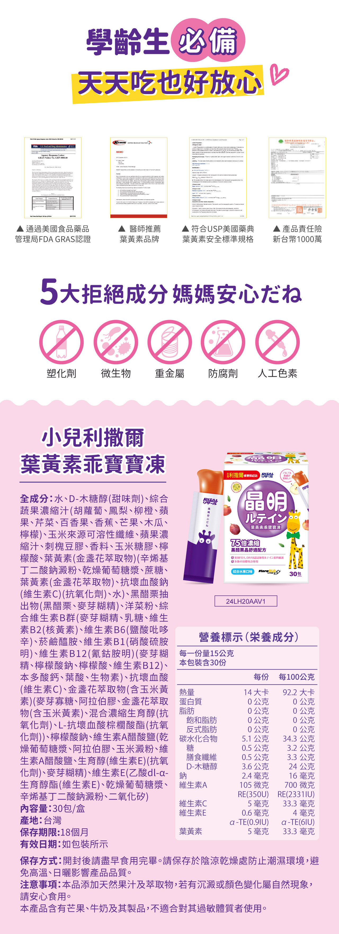 晶明保護˙雙游離型,黃金比例搭檔-葉黃素5mg:玉米黃素1mg晶適有神˙75倍濃縮黑醋栗-每包添加50mg,含D3R 及C3R型花青素˙添加Vit E具抗氧化作用均衡蔬果纖維果凍添加多種維生素及綜合蔬果濃縮汁-胡蘿蔔、鳳梨、柳橙、蘋果、芹菜、百香果、香蕉、芒果、木瓜、檸檬木醣醇+水溶性膳食纖維 550mg *無額外添加砂糖、色素、防腐劑
