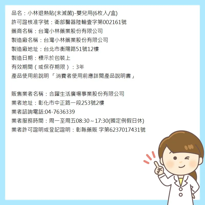小林退熱貼添加獨特吸熱分子,貼在額頭上可達到退熱效果。特殊設計能與肌膚緊密貼合,不易脫落。不需冷藏,可常溫放置,方便取用。
