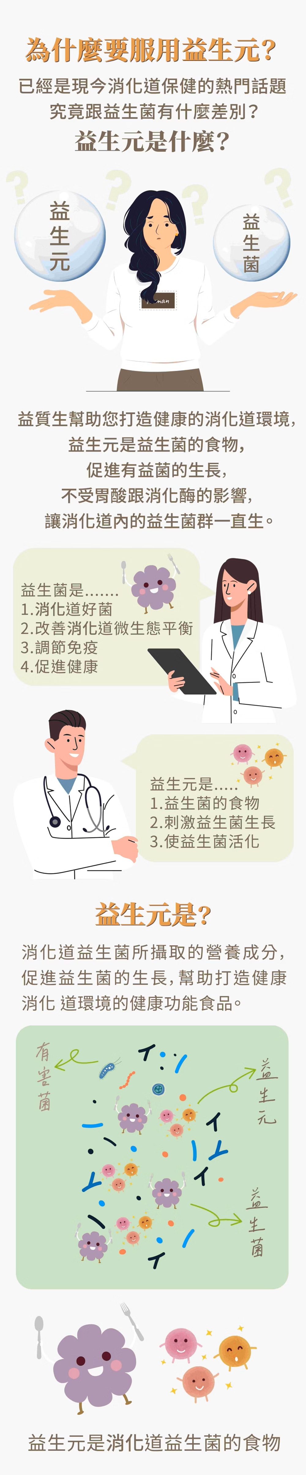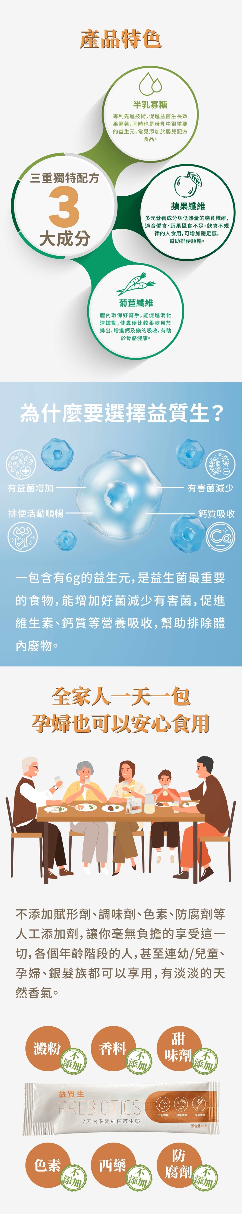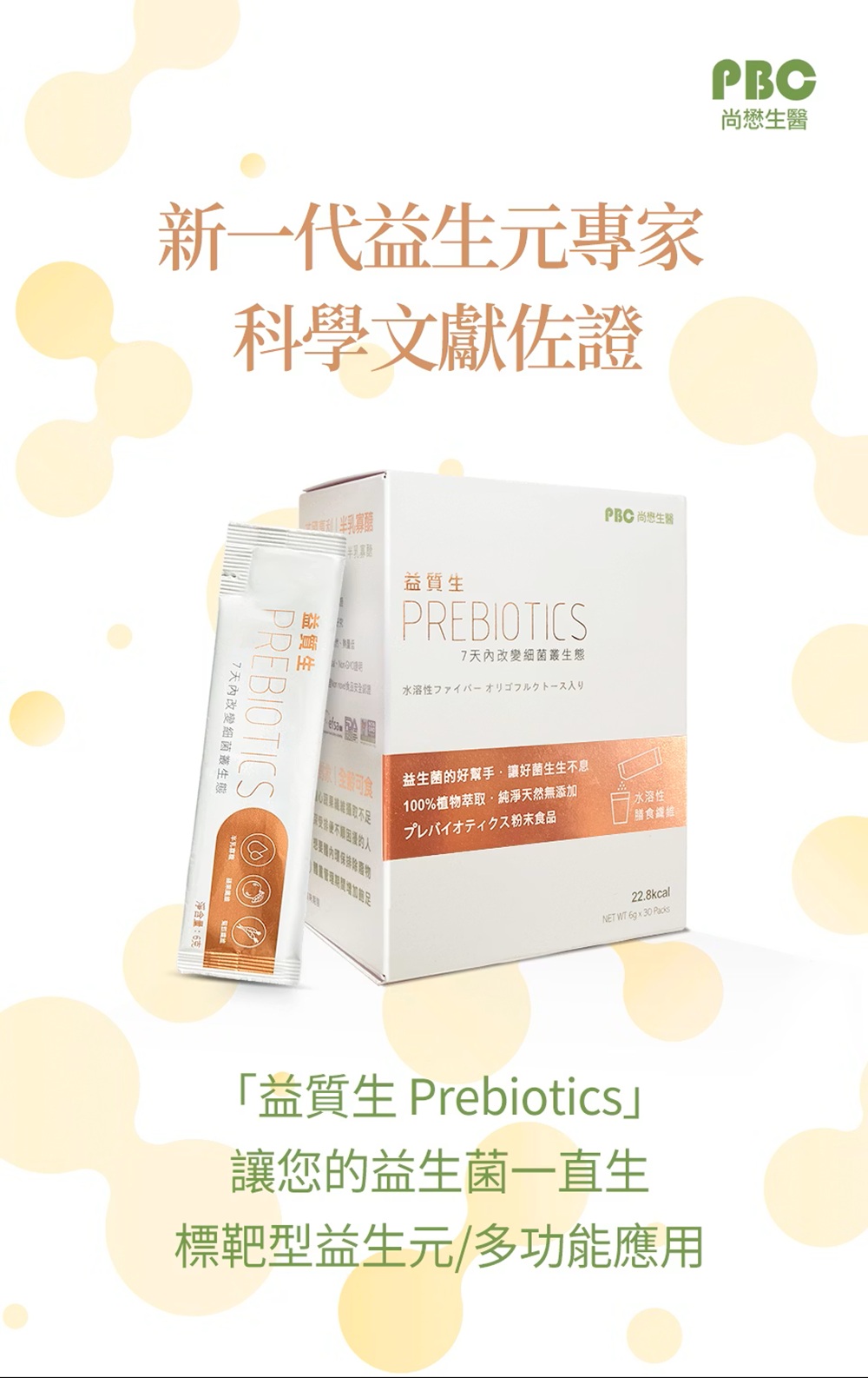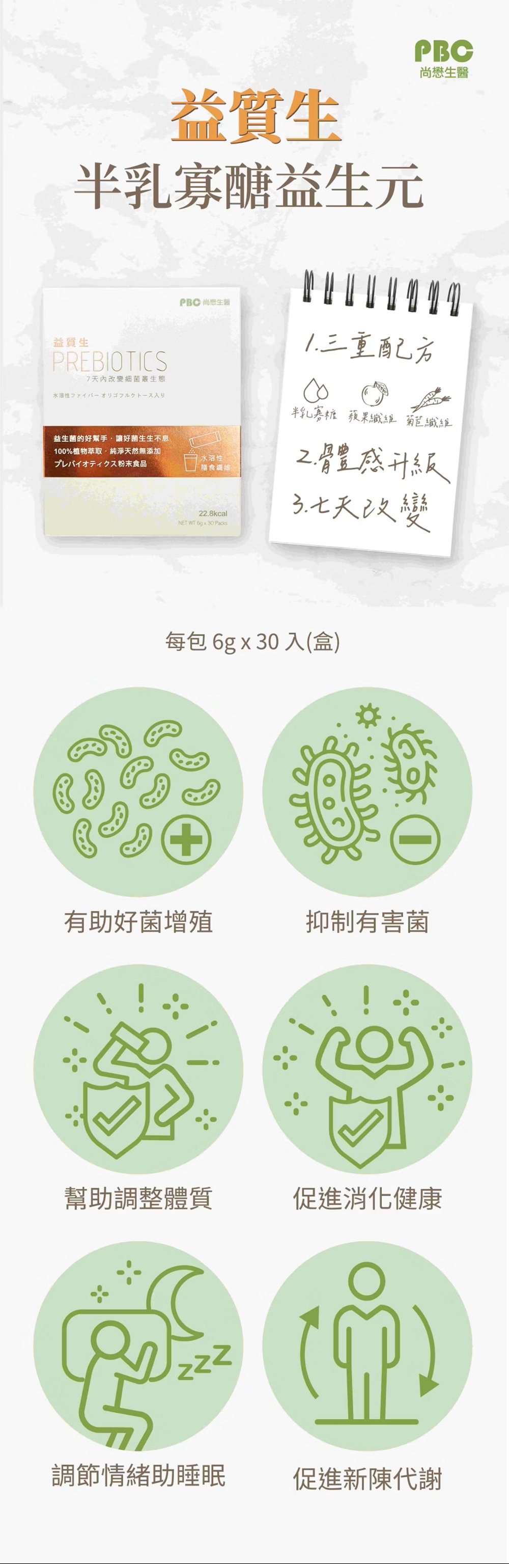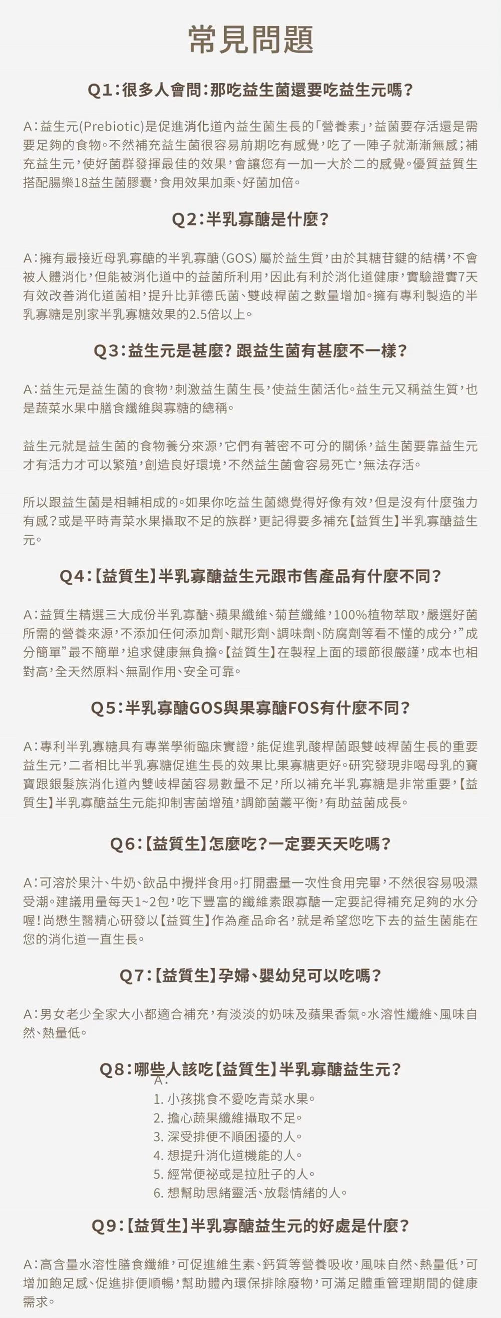 益質生|半乳寡醣益生元✦ 抑制害菌增殖,調節菌叢平衡,有助益菌成長✦ 高含量膳食纖維可增加飽足感、促進排便順暢✦ 可沖泡於果汁、茶飲等任何飲品拌勻使用✦ 擁有最接近母乳寡醣的半乳寡醣(GOS)✦ 全天然原料、無副作用、安全可靠✦ 水溶性纖維、風味自然、熱量低✦ 多項國際食品安全認證:FDA GRAS、EFSA、FSANZ、GMP、ISO9000✦ 全球超過100篇學術發表, 60篇專利認證,22篇以上人體臨床研究本產品以半乳寡醣、蘋果纖維、菊苣纖維作為益生元,又稱益生質、益菌生,高含量水溶性膳食纖維,能補充人體攝取不足的纖維質,短時間讓您順暢有感,全面鞏固消化道健康。規格說明成 分:菊苣纖維、半乳寡醣、蘋果纖維規 格:6g/包,30包/盒食用方法:1天1~2包,可沖泡於果汁、茶飲、咖啡等飲品拌勻飲用。保存方式:請置於陰涼乾燥處,避免陽光直射,開封後請儘早食用完畢。保存期限:3年原 產 地:台灣負責廠商:尚懋生醫股份有限公司地 址:台北市士林區承德路四段222號6樓消費者服務專線:(02)8861-3885 (9:00-17:30) 非假日※本產品已投保產品責任險,投保金額不等同理賠金額。※本產品由獲HACCP/ISO22000等食品安全檢驗廠生產。常見問題Q1:很多人會問:那吃益生菌還要吃益生元嗎?益生元(Prebiotic)是促進消化道內益生菌生長的「營養素」,益菌要存活還是需要足夠的食物。不然補充益生菌很容易前期吃有感覺,吃了一陣子就漸漸無感;補充益生元,使好菌群發揮最佳的效果,會讓您有一加一大於二的感覺。優質益質生搭配腸楽18益生菌膠囊,食用效果加乘、好菌加倍。 Q2:半乳寡醣是什麼?擁有最接近母乳寡醣的半乳寡醣(GOS)屬於益生質,由於其糖苷鍵的結構,不會被人體消化,但能被消化道中的益菌所利用,因此有利於消化道健康,實驗證實7天有效改善消化道菌相,提升比菲德氏菌、雙歧桿菌之數量增加。擁有專利製造的半乳寡糖是別家半乳寡糖效果的2.5倍以上。 Q3:益生元是甚麼? 跟益生菌有甚麼不一樣?益生元是益生菌的食物,刺激益生菌生長,使益生菌活化。益生元又稱益生質,也是蔬菜水果中膳食纖維與寡糖的總稱。益生元就是益生菌的食物養分來源,它們有著密不可分的關係,益生菌要靠益生元才有活力才可以繁殖,創造良好環境,不然益生菌會容易死亡,無法存活。所以跟益生菌是相輔相成的。如果你吃益生菌總覺得好像有效,但是沒有什麼強力有感?或是平時青菜水果攝取不足的族群,更記得要多補充【益質生】半乳寡醣益生元。 Q4:【益質生】半乳寡醣益生元跟市售產品有什麼不同?益質生精選三大成份半乳寡醣、蘋果纖維、菊苣纖維,100%植物萃取,嚴選好菌所需的營養來源,不添加任何添加劑、賦形劑、調味劑、防腐劑等看不懂的成分,”成分簡單”最不簡單,追求健康無負擔。【益質生】在製程上面的環節很嚴謹,成本也相對高,全天然原料、無副作用、安全可靠。 Q5:半乳寡醣GOS與果寡醣FOS有什麼不同?專利半乳寡糖具有專業學術臨床實證,能促進乳酸桿菌跟雙岐桿菌生長的重要益生元,二者相比半乳寡糖促進生長的效果比果寡糖更好。研究發現非喝母乳的寶寶跟銀髮族腸道內雙岐桿菌容易數量不足,所以補充半乳寡糖是非常重要,【益質生】半乳寡醣益生元能抑制害菌增殖,調節菌叢平衡,有助益菌成長。 Q6:【益質生】怎麼吃?一定要天天吃嗎?可溶於果汁、牛奶、飲品中攪拌食用。打開盡量一次性食用完畢,不然很容易吸濕受潮。建議用量每天1~2包,吃下豐富的纖維素跟寡醣一定要記得補充足夠的水分喔!尚懋生醫精心研發以【益質生】作為產品命名,就是希望您吃下去的益生菌能在您的消化道一直生長。 Q7:【益質生】孕婦、嬰幼兒可以吃嗎?男女老少全家大小都適合補充,有淡淡的奶味及蘋果香氣。水溶性纖維、風味自然、熱量低。 Q8:哪些人該吃【益質生】半乳寡醣益生元? 1. 小孩挑食不愛吃青菜水果。2. 擔心蔬果纖維攝取不足。3. 深受排便不順困擾的人。4. 想提升消化道機能的人。5. 經常便祕或是拉肚子的人。6. 想要思緒靈活、放鬆情緒的人。 Q9:【益質生】半乳寡醣益生元的好處是什麼?高含量水溶性膳食纖維,可促進維生素、鈣質等營養吸收,風味自然、熱量低,可增加飽足感、促進排便順暢,幫助體內環保排除廢物,可滿足體重管理期間的健康需求。