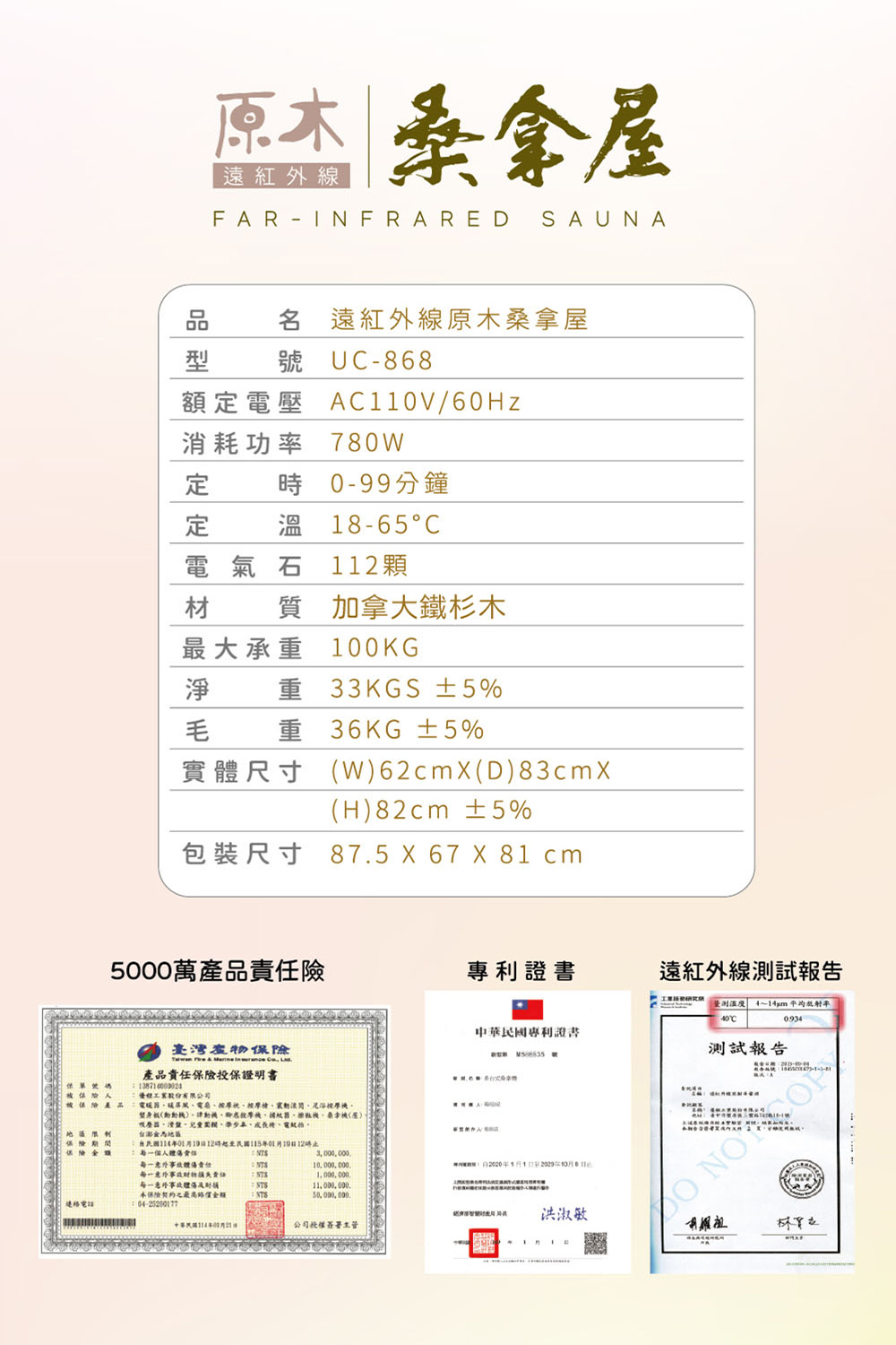 반신욕 사우나★獨家專利★ 頂 級 御 用 款■全身/半身,兩用式 原木桑拿屋■免組裝,附煞車底輪,好移動,隨開即用■嚴選加拿大鐵杉木100%手工打造■數位控制面板,可定溫定時■智慧恆溫系統,18-65度可調整■7片遠紅外線碳晶加熱板,加熱速度快■5個金屬散熱孔,過熱自動斷電系統■112顆養生黑碧璽,釋放微弱電流及溫熱能量■工研院遠紅外線測試,放射率達93.4%■5000萬產品責任險■附贈:高級毛毯、桑拿服、藥草包x2、藥草麻袋、說明書、保證卡◎貼心提醒◎ 本產品尺寸較大(寬62x深83x高82cm),請先量妥家中擺放位置的長寬高後,再購買。本產品屬於親膚接觸的衛生品關係(注意!網購猶豫期非試用期)辦理退貨商品必須是"全新未拆封膜狀態"且"包裝完整",否則將會影響退貨權限。