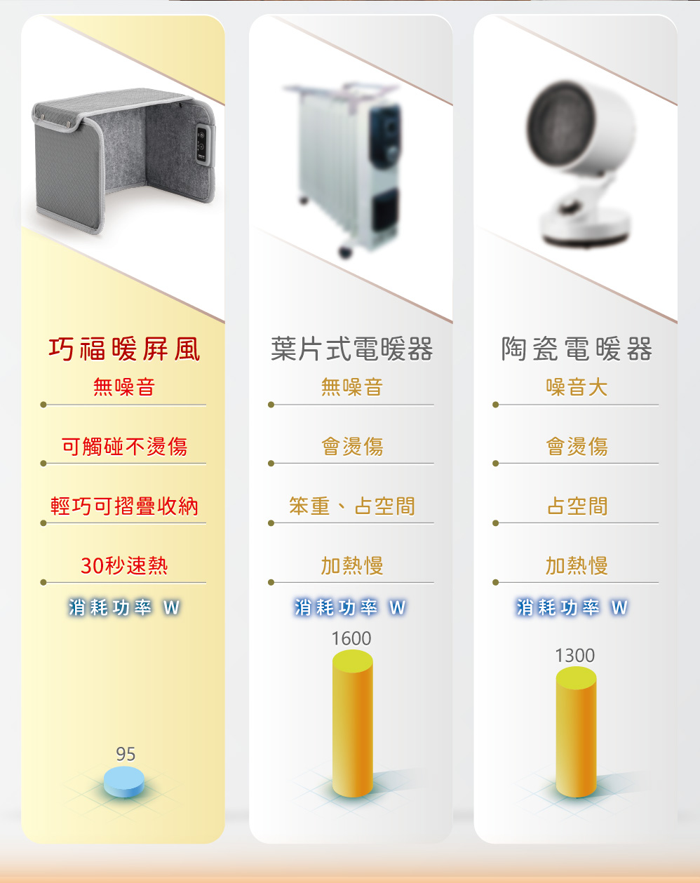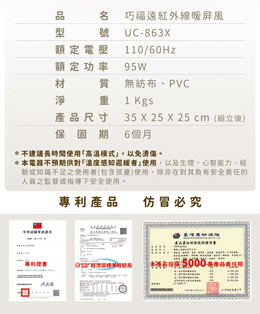 遠紅外線、速暖、保暖■ 速暖,30秒快速加熱■ 無補充,免耗材、免燃料■ 省電、無味、靜音、不耗氧■ 足、膝兩用,輕巧便利■ 摺疊收納,不佔空間■ 強、中、弱三段溫度調整■ 傾倒自動斷電裝置■ 外側阻熱防燙設計■ 4小時自動斷電裝置■ 數位恆溫裝置■ 遠紅外線炭纖維發熱■ 附贈上蓋,保暖效果更加■工研院遠紅外線測試,放射率達84.7%■ 經濟部標準檢驗局檢驗合格R51286■ 5000萬產品責任險■ 保固期:6個月