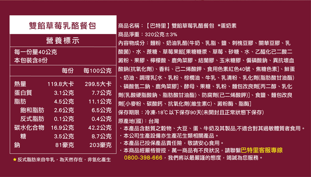 【巴特里】雙餡草莓乳酪餐包 2盒裝