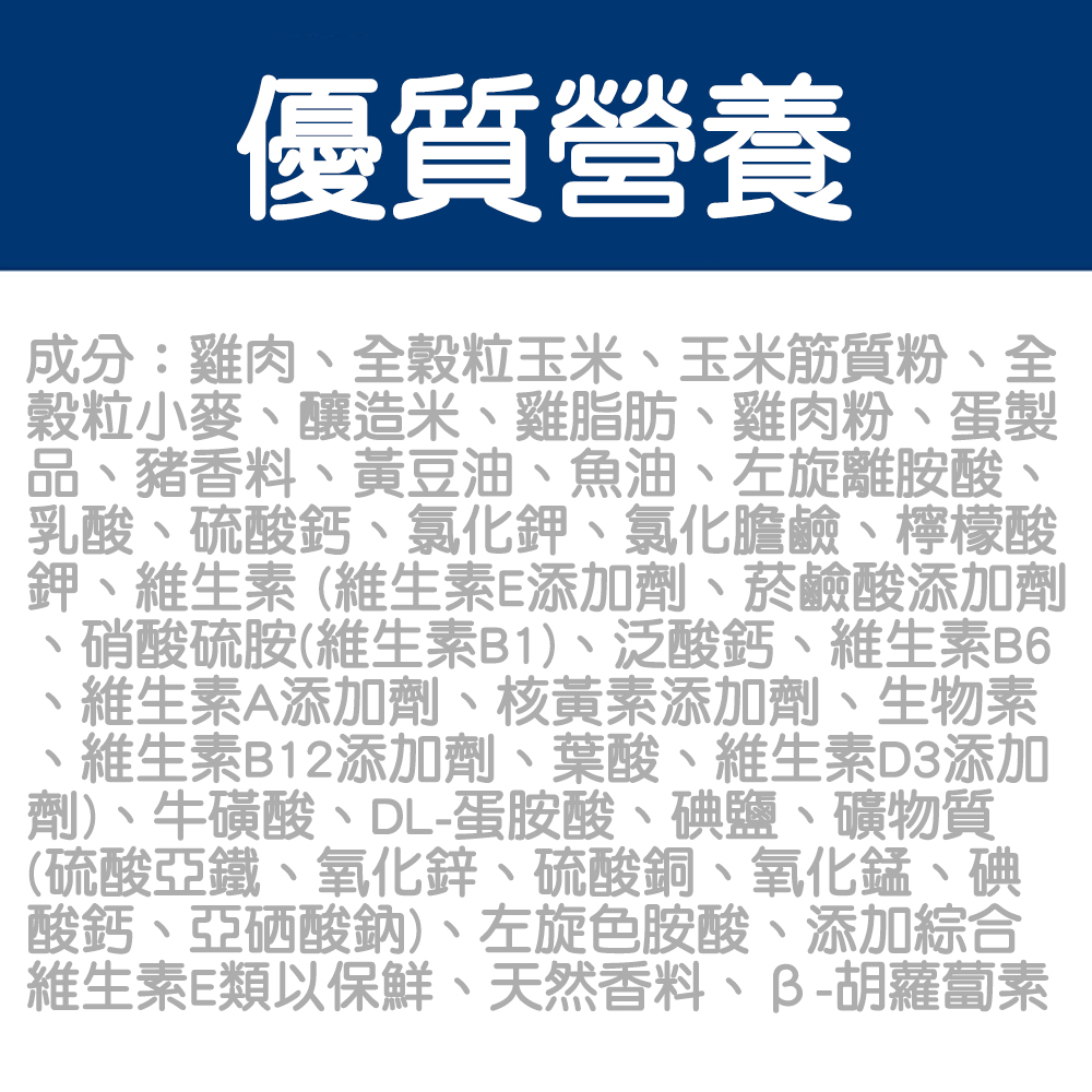 釀造米、玉米筋質粉、雞肉副產品粉、豬脂肪(以混合維生素E及檸檬酸保存)、雞肉、雞肝香料、乳酸、魚油、氯化膽鹼、氯化鉀、硫酸鈣、維生素E添加劑、碘鹽、檸檬酸鉀、蛋氨酸、維生素(維生素E添加劑、菸鹼酸、維生素B1、維生素B6、泛酸鈣、核黃素、生物素、維生素B12添加劑、維生素A添加劑、葉酸、維生素D3添加劑)、牛磺酸、 礦物質(硫酸亞鐵、氧化鋅、硫酸銅、氧化錳、碘酸鈣、亞硒酸鈉)、以混合維生素E及檸檬酸保存、磷酸、天然香料、β-胡蘿蔔素。