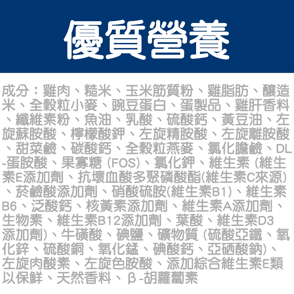 雞肉、釀造米、玉米筋質粉、全穀粒小麥、豬肉脂肪、糙米、麥麩、雞肝香料、脫水甜菜漿、亞麻仁籽、蛋製品、乳酸、碳酸鈣、黃豆油、氯化鉀、氯化膽鹼、檸檬酸鉀、DL-蛋胺酸、磷酸二鈣、維生素(維生素E添加劑、抗壞血酸多聚磷酸酯(維生素C來源)、菸鹼酸添加劑、維生素B1、維生素A添加劑、泛酸鈣、核黃素添加劑、生物素、維生素B12添加劑、維生素B6、葉酸、維生素D3添加劑)、牛磺酸、左旋離胺酸、硫酸鈣、礦物質(硫酸亞鐵、氧化鋅、硫酸銅、氧化錳、碘酸鈣、亞硒酸鈉)、添加綜合維生素E及檸檬酸以保鮮、左旋色胺酸、碘鹽、天然香料、β-胡蘿蔔素。