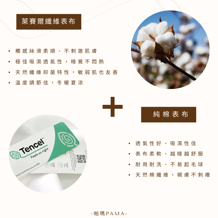 表布:50% 萊賽爾纖維 × 50% 棉【親膚、透氣不悶熱】