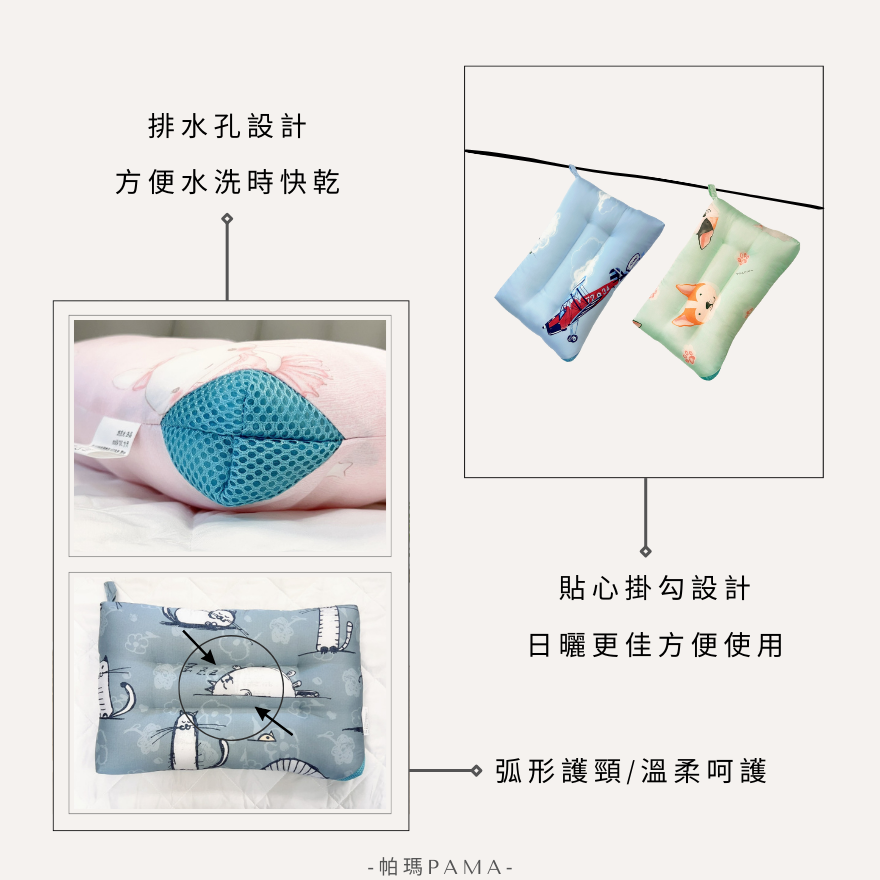 枕頭側邊貼心附掛勾,一洗就能直接吊掛晾乾,家長不需額外找夾子,日曬更快速、乾爽不易潮。