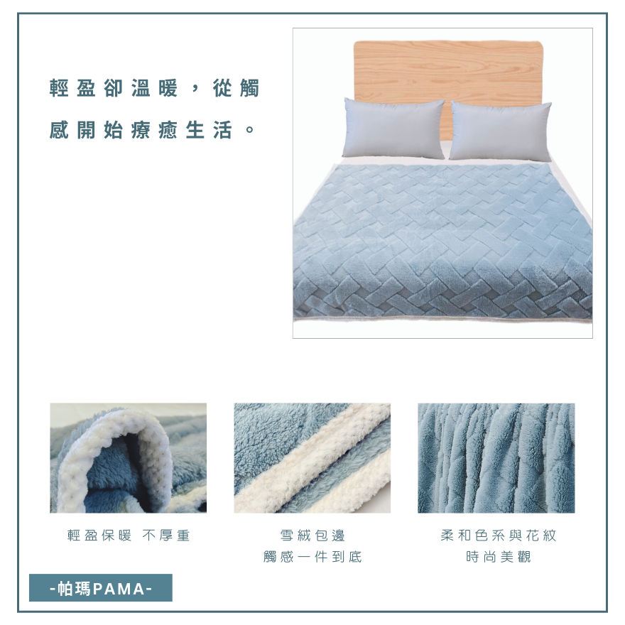 冬天保暖、夏天冷氣房蓋用都舒適,也可當沙發毯、車用毯、午睡毯。