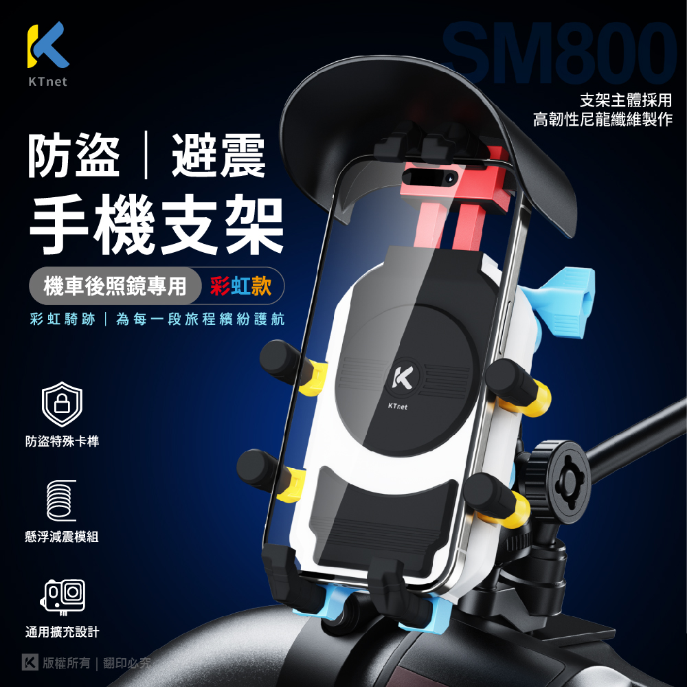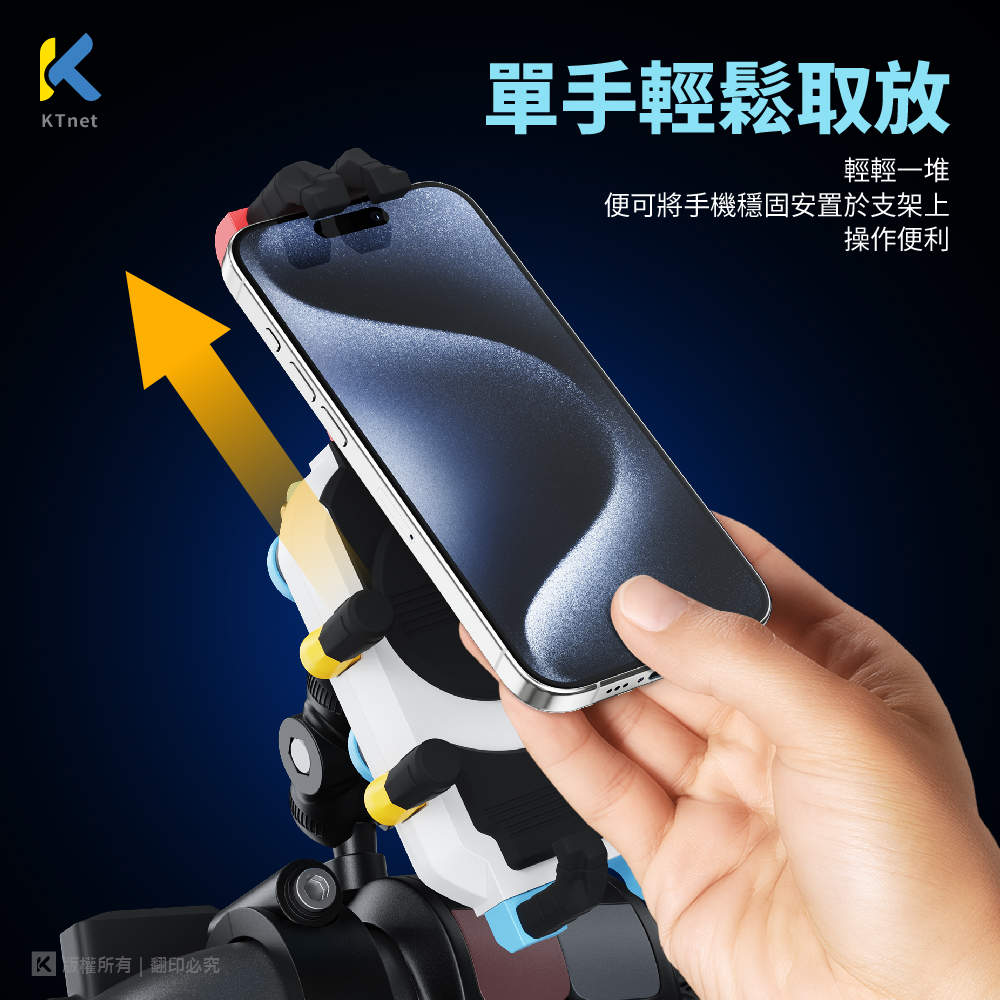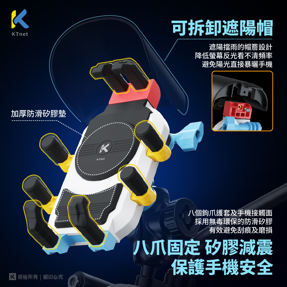 ■遮陽擋雨的帽簷設計 降低螢幕反光看不清楚頻率,避免陽光直接曝曬手機■高強度鉤爪 強力緊抱手機,穩固不掉落■四角懸浮減震裝置 矽膠防震柱設計,有效減少震動