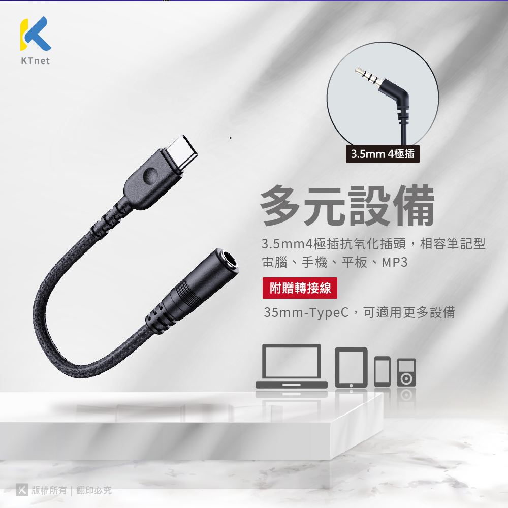 ■3.5mm 4極插抗氧化插頭 ■附贈轉接線3.5mm-TypeC,可適用更多設備產品尺寸 : (L)170x(W)180x(H)58mm產品重量 : 105g±5g含包裝重量 : 179g±5g產 地 : 中國材 質 : ABS塑膠+電子元件包裝尺寸 : (L)233x(W)152x(H)31mm包裝內容 : 耳麥x1、轉接線x1、收納袋x1