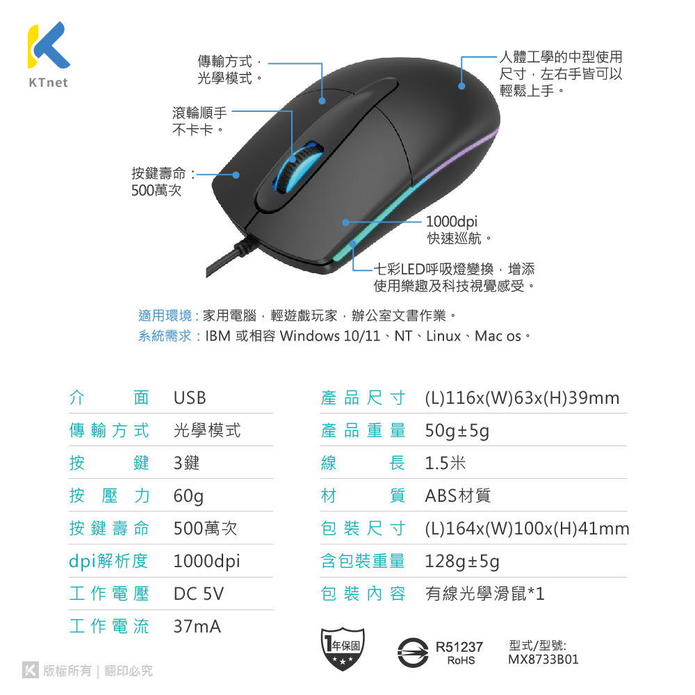 特色:■七彩LED呼吸燈變換,增添使用樂趣及科技視覺感受■人體工學的中型使用尺寸,左右手皆可以輕鬆上手■3鍵式設計,1000DPI快速巡航■腰燈微緩呼吸燈,有放鬆心情及指引方位的效果■適用環境 : 家用電腦,輕遊戲玩家,辦公室文書作業產品尺寸 : (L)116x(W)63x(H)39mm產品重量 : 50g±5g含包裝重量 : 128g±5g產 地 : 中國材 質 : ABS塑膠包裝尺寸 : (L)164x(W)100x(H)41mm包裝內容 : 有線光學滑鼠*1