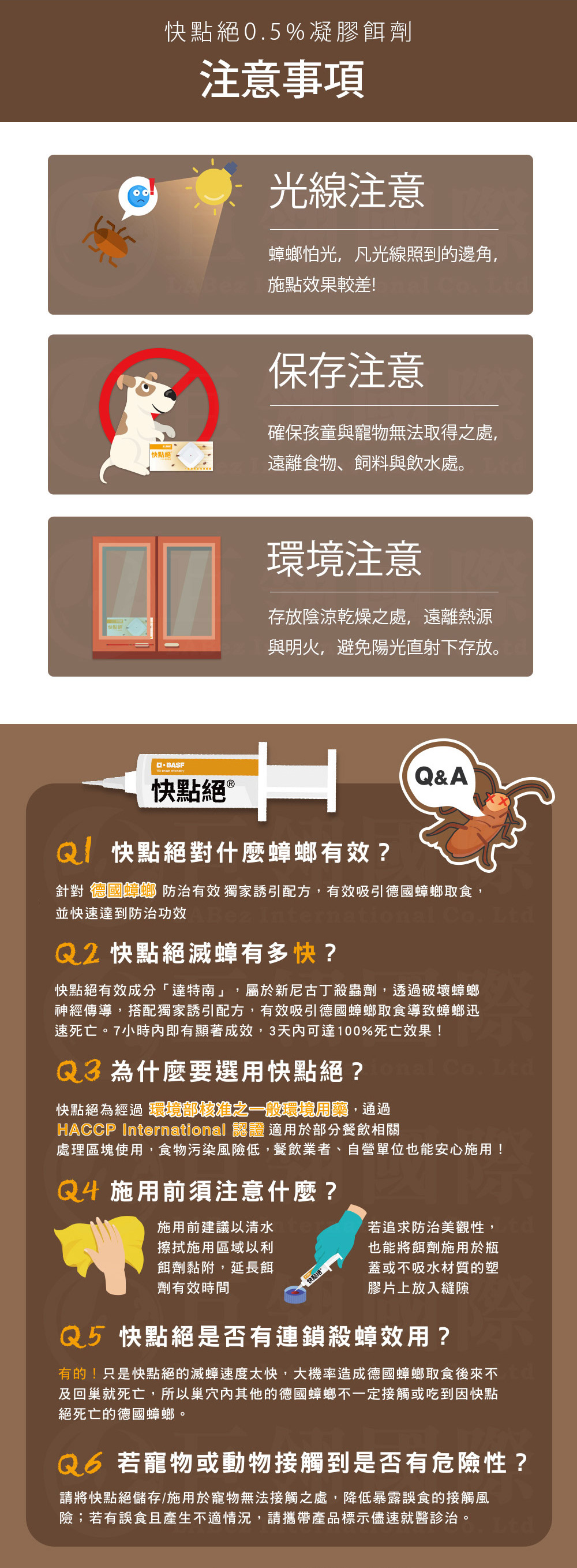 1.滅蟑速效 : 蟑螂取食快點絕後3~5小時死亡,可在短時間內迅速降低危害密度。